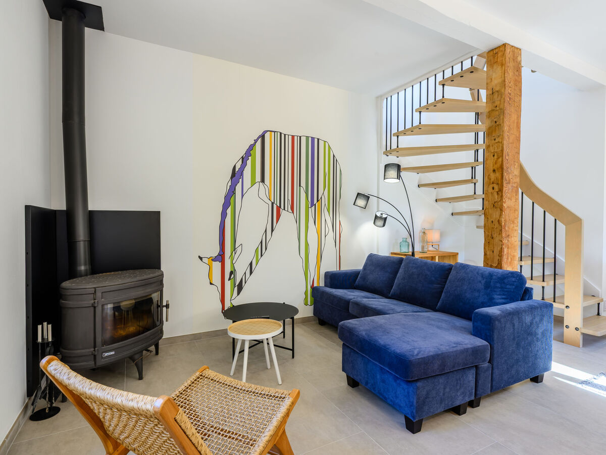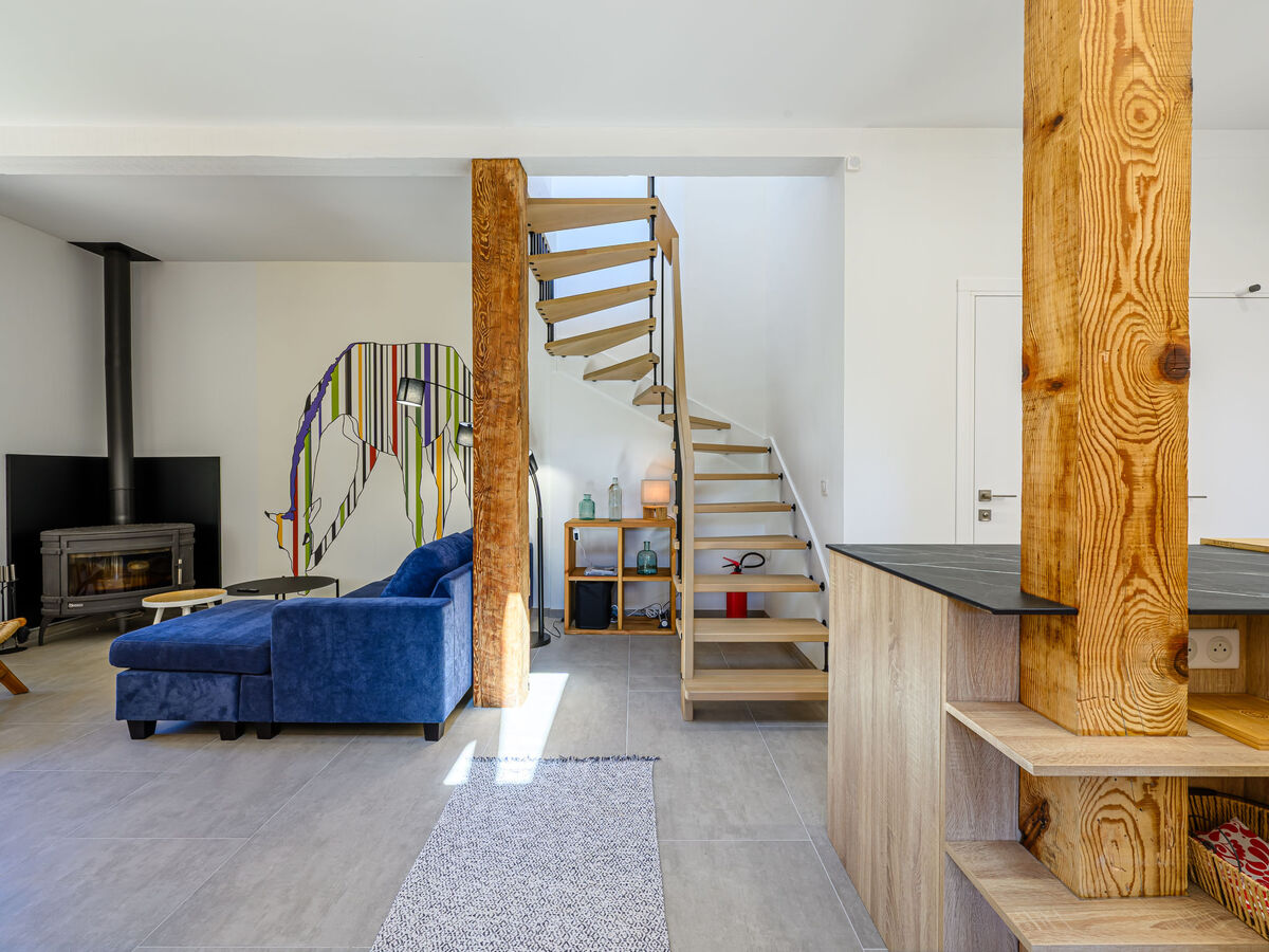 Aménagement confortable et agréable: séjour/salle à manger avec TV (écran plat), poêle à bois.