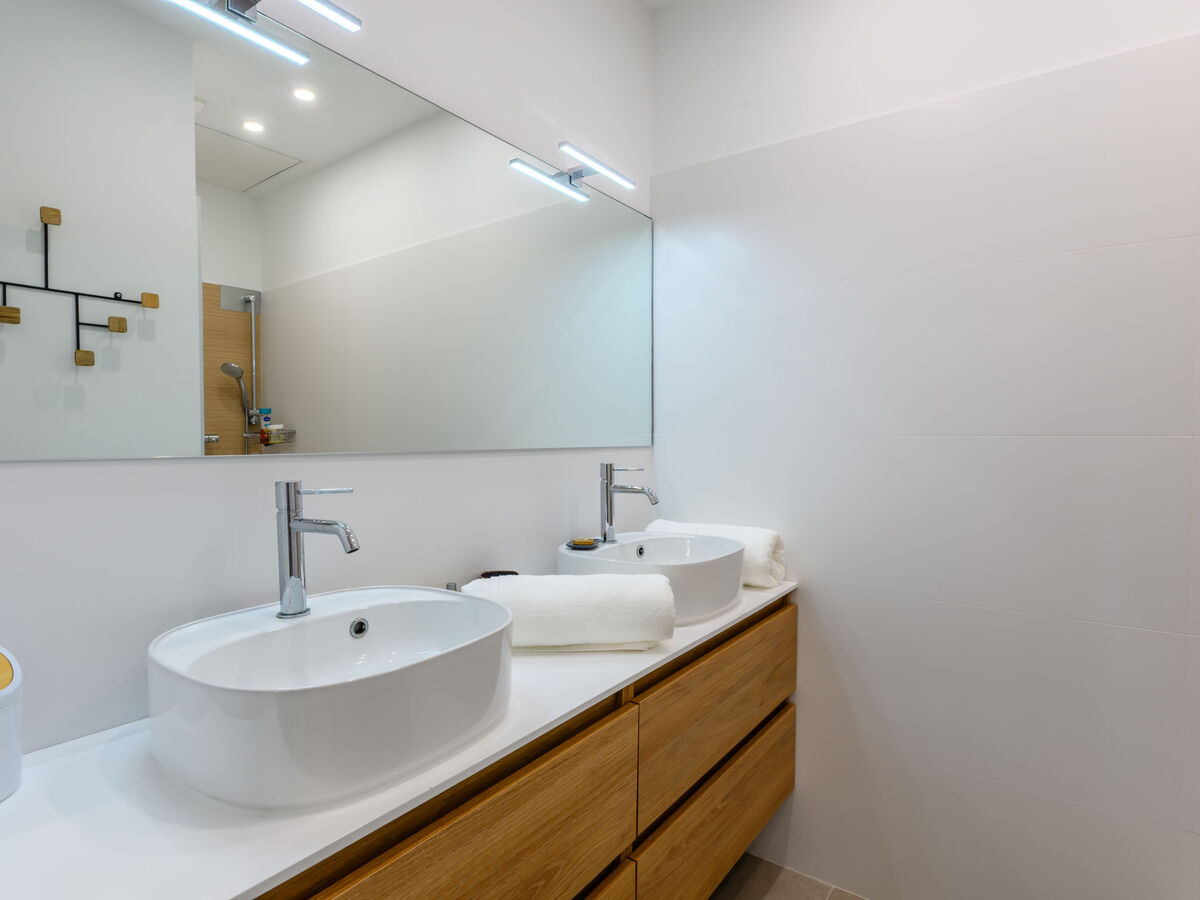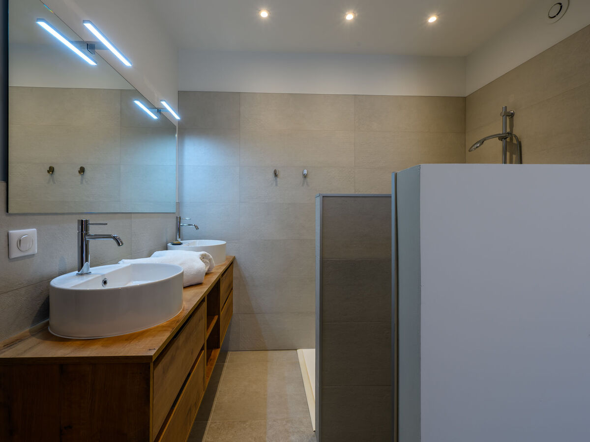 Douche, WC séparé, double vasque.