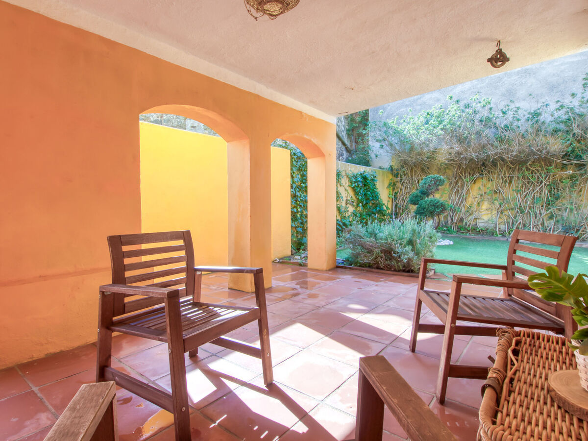 Terrasse, meubles de jardin, barbecue, place de parking sur le terrain.