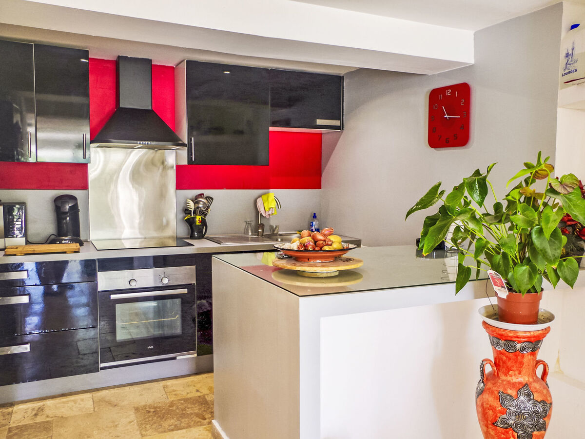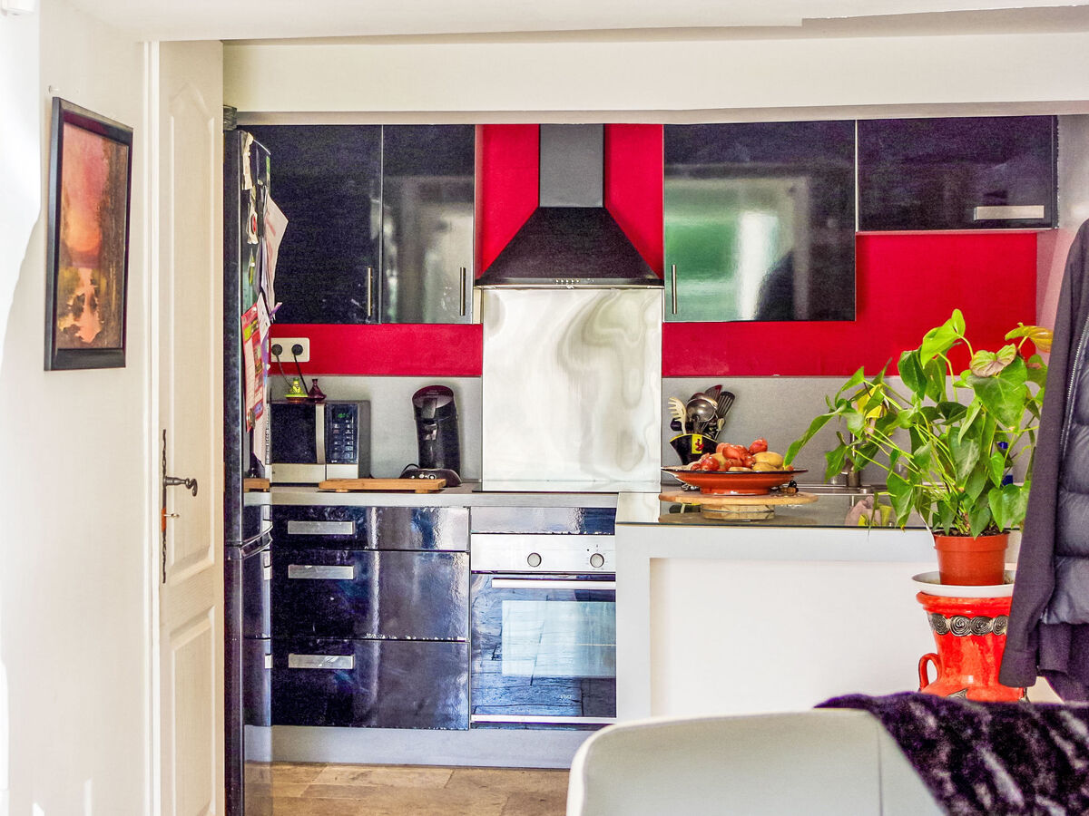 Petite cuisine ouverte (four, lave-vaisselle, 3 plaques à induction, grille-pain, bouilloire électrique, micro-ondes, gril, cafetière électrique, Capsules pour machine à café (Senseo) (NON INCLUSES)).