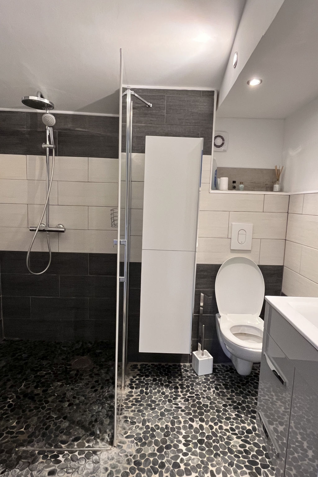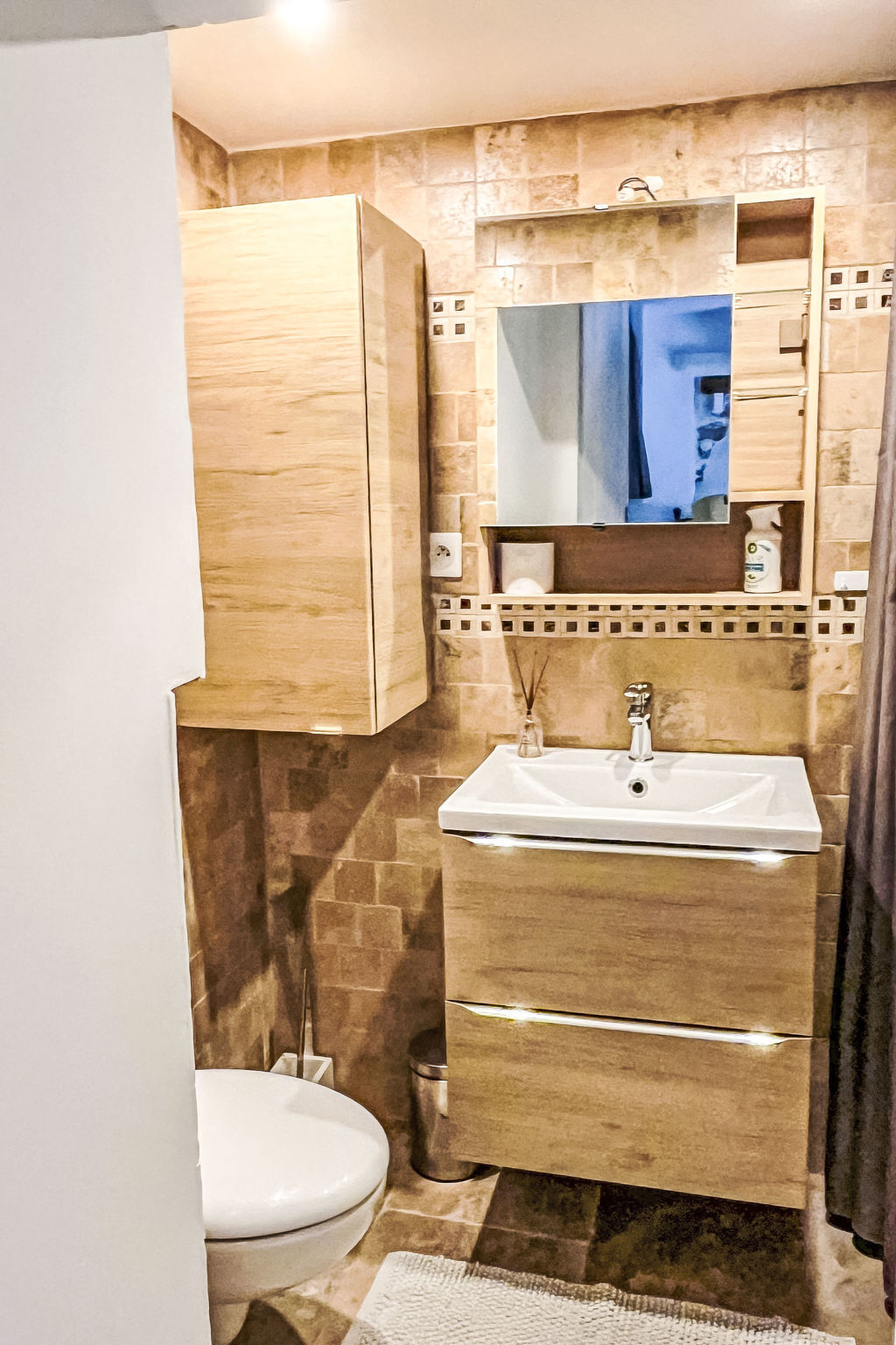1 chambre avec 1 grand-lit (140 cm, longueur 190 cm), douche/WC et TV (écran plat).