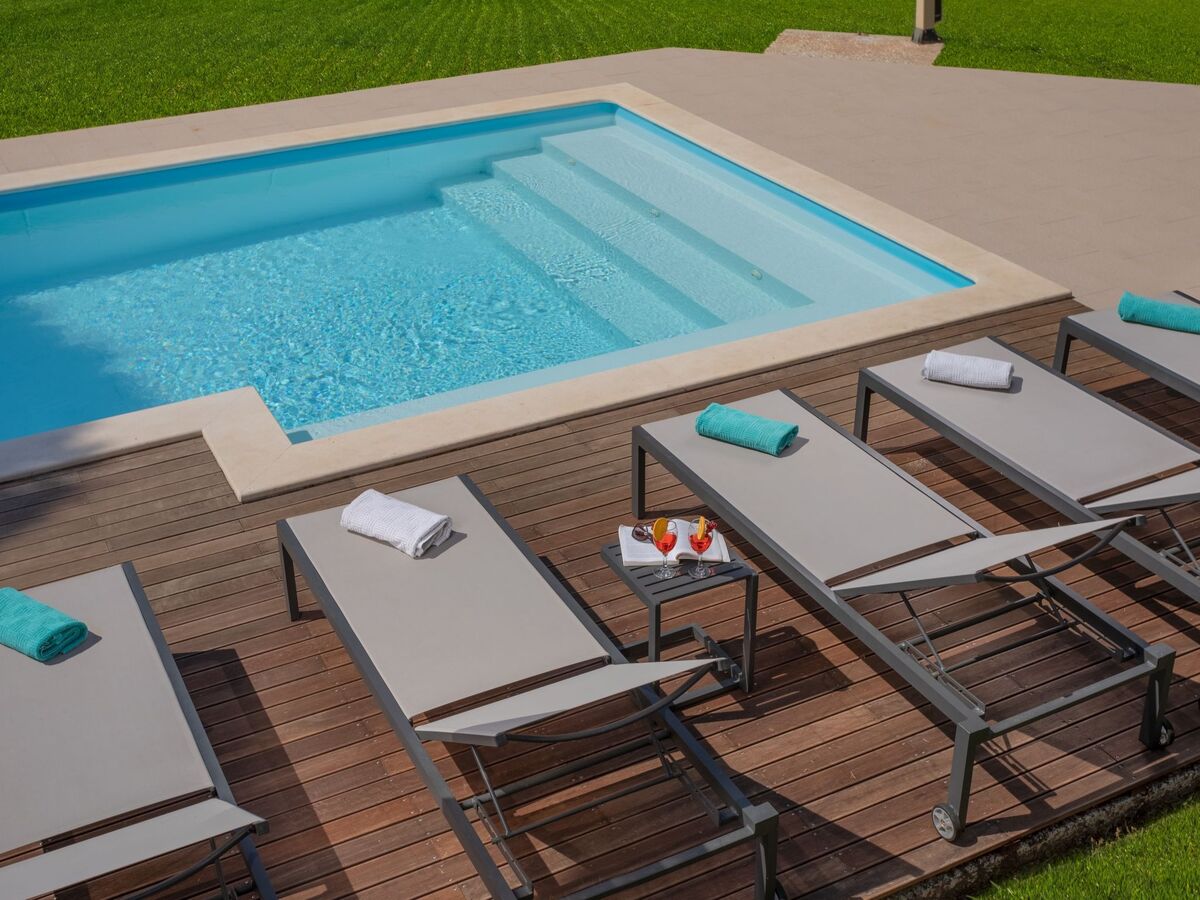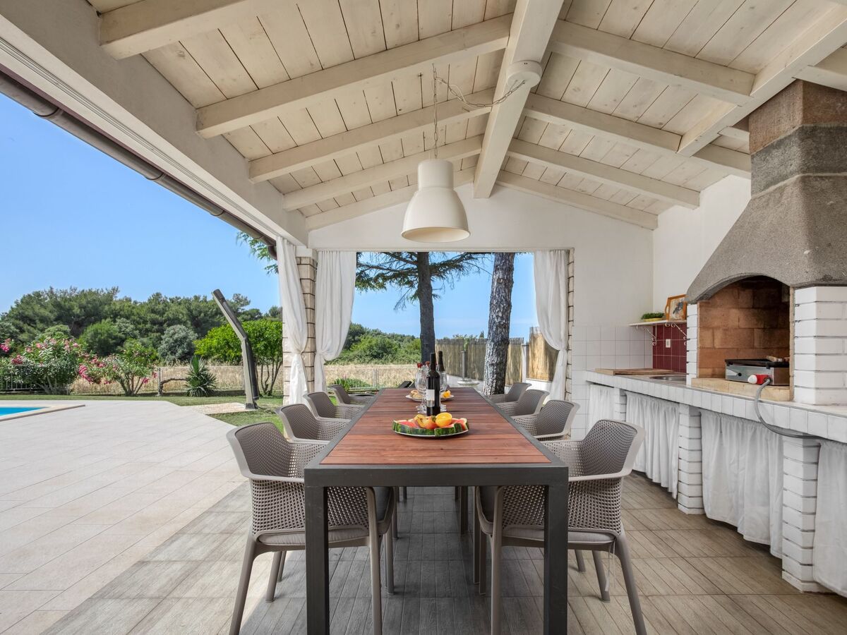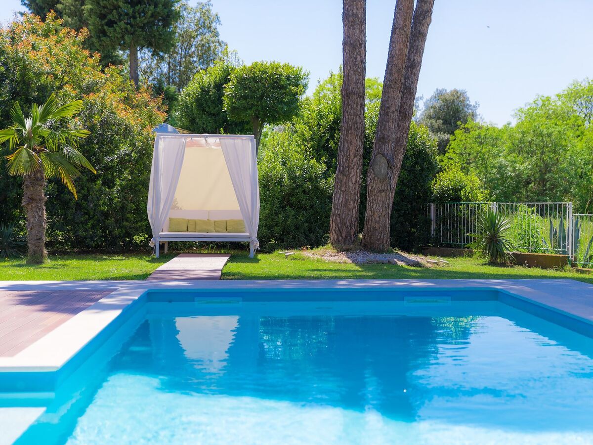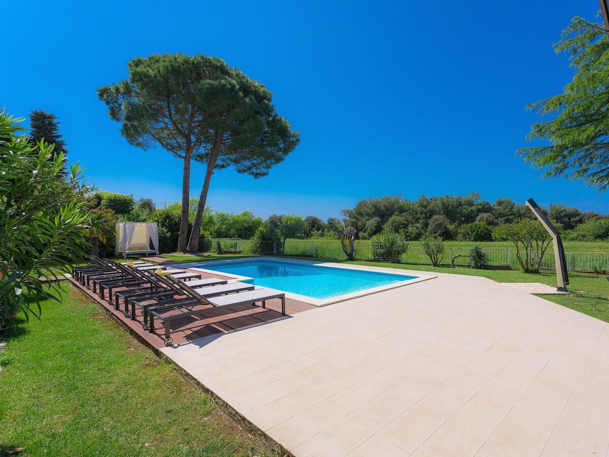 Douche extérieure, pool house avec réfrigérateur et plaque de cuisson, barbecue.