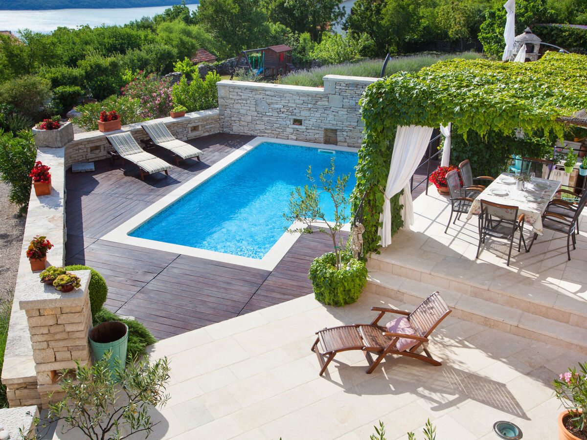 A usage privé: terrain 1'400 m2 (clôturé) avec pelouse, piscine rectangulaire, chauffée (24 m2, profondeur 110 - 140 cm, disponibilité saisonnière: 01.Jan.