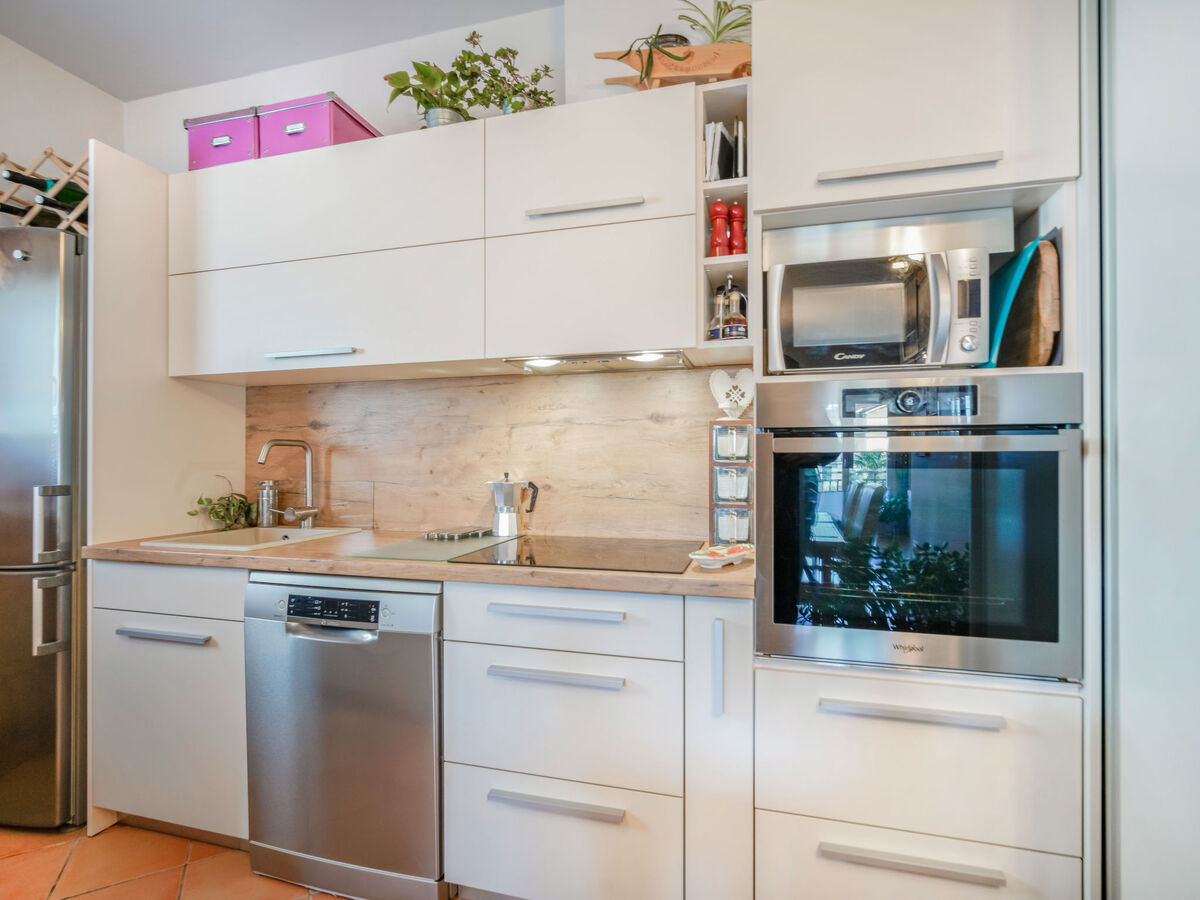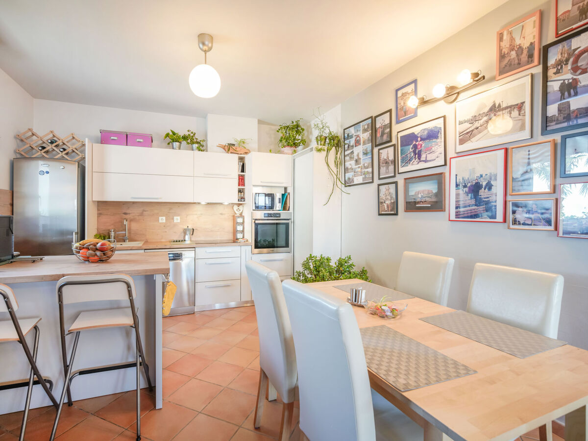 Cuisine ouverte (four, lave-vaisselle, 4 plaques vitrocéramiques, micro-ondes, congélateur, cafetière électrique).