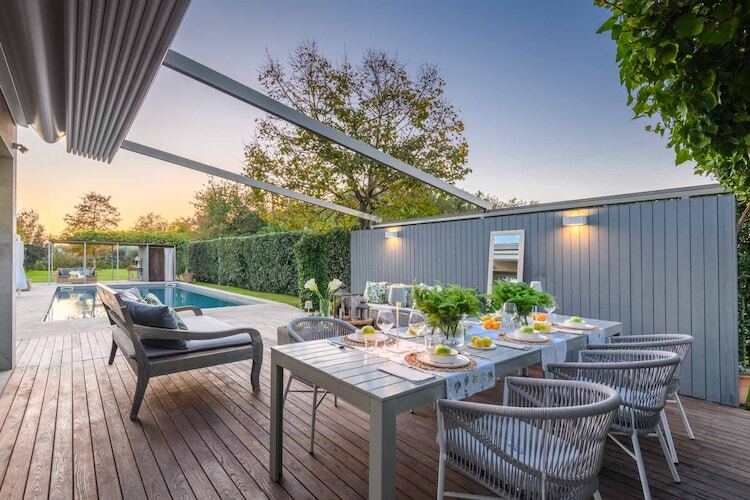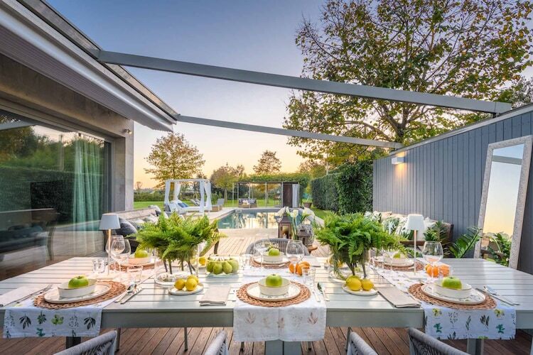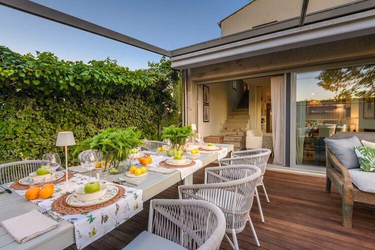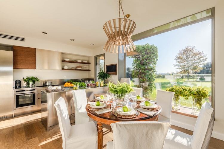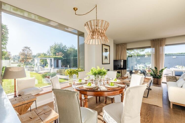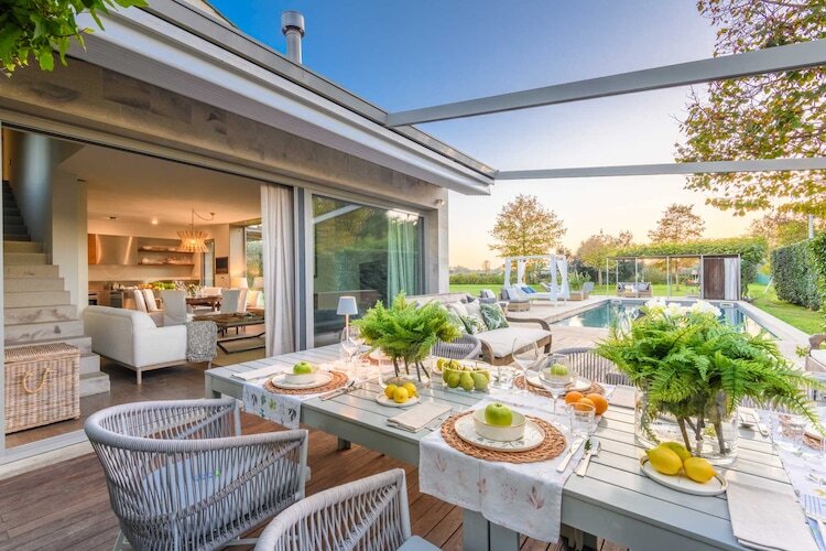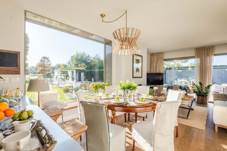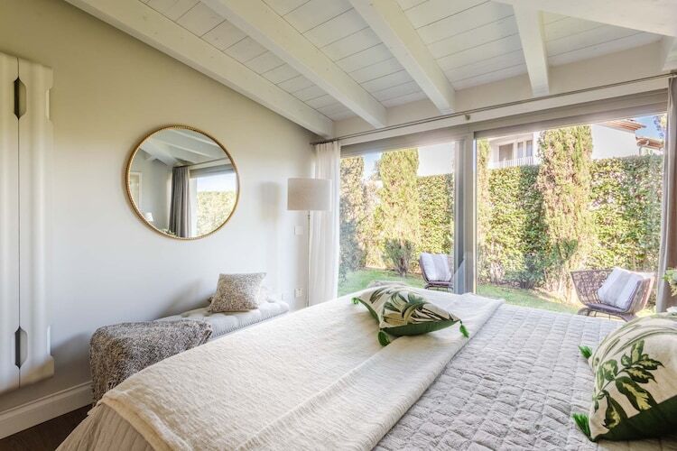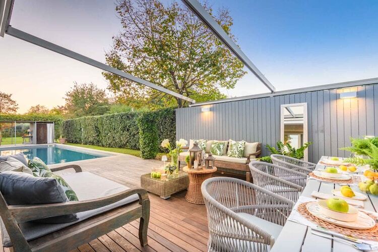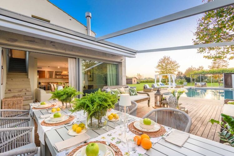 cuisine(bouilloire, grille-pain, cafetière/percolateur, four, micro ondes, lave-vaisselle , réfrigérateur, congélateur, Presse-agrumes, ), salle à manger-salon(TV, table, coin salon), chambre(lit double), chambre(lit double), chambre(lit double), salle de bains(douche), salle de bains(douche), salle de bains(douche), Meubles de jardin, lit bébé, lave-linge , climatisation, jardin, jardin(clôturé), barbecue, parking, piscine(privé), chaise haute, fer à repasser, sèche-cheveux
