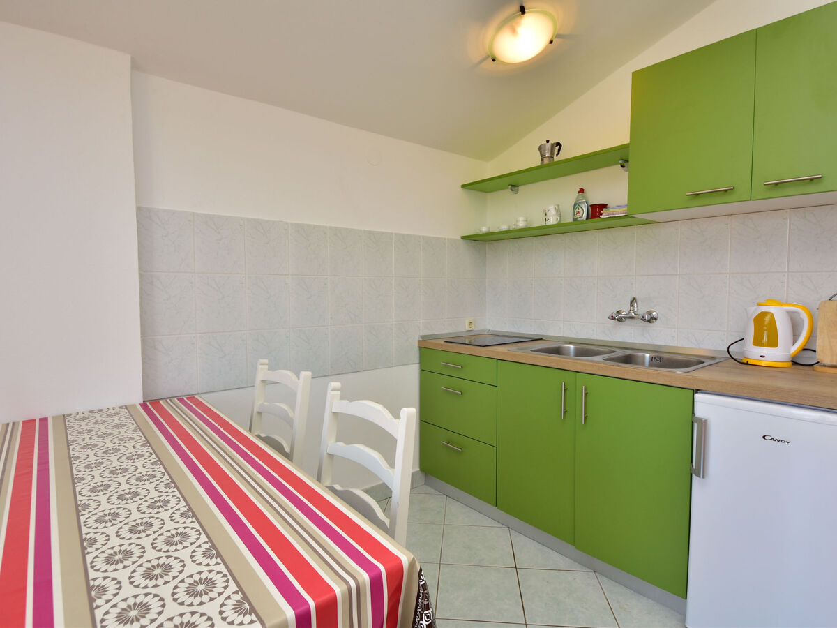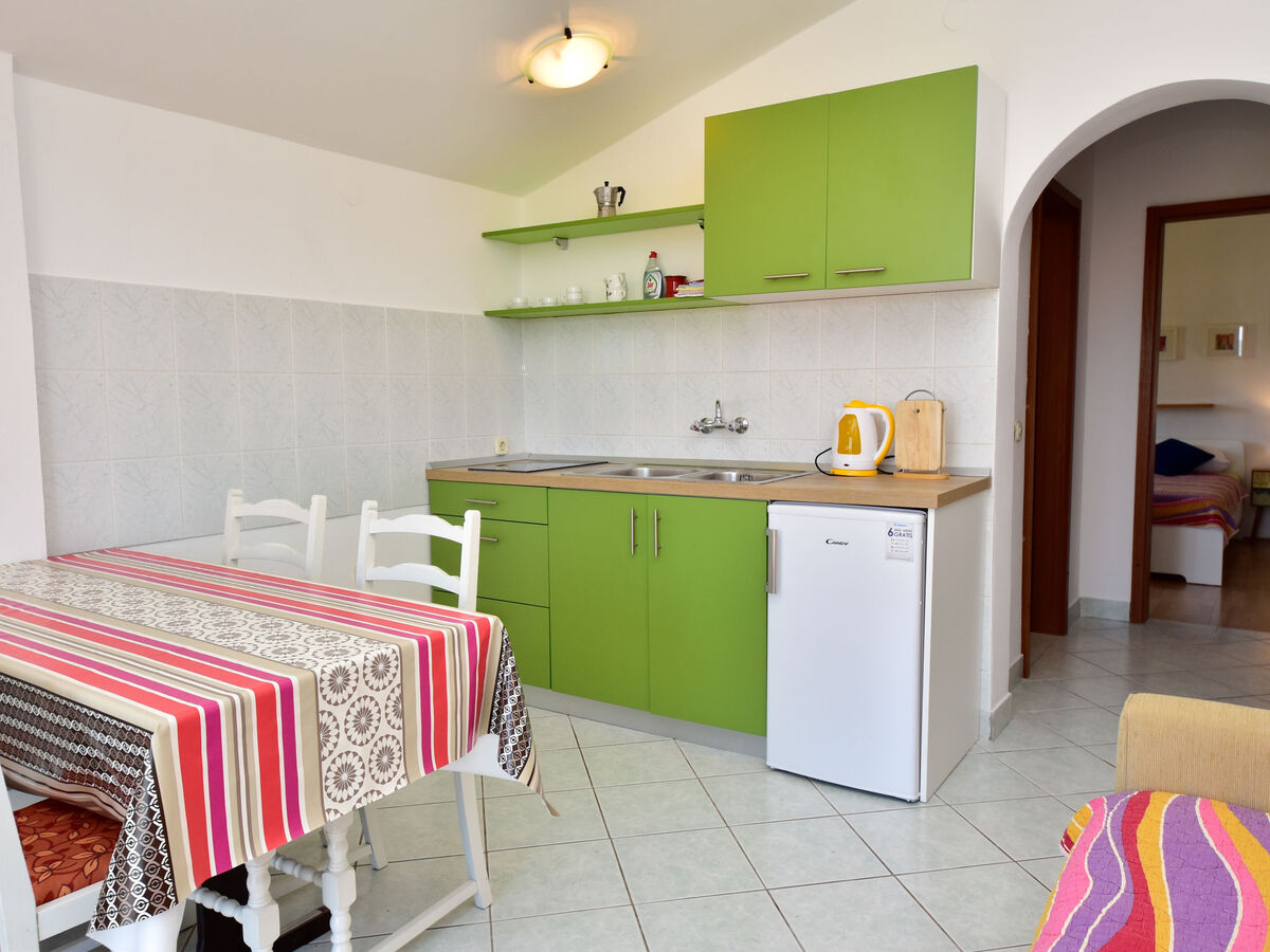 Cuisine ouverte (2 plaques de cuisson) avec table pour les repas, air-conditionné.
