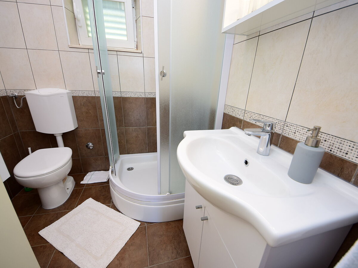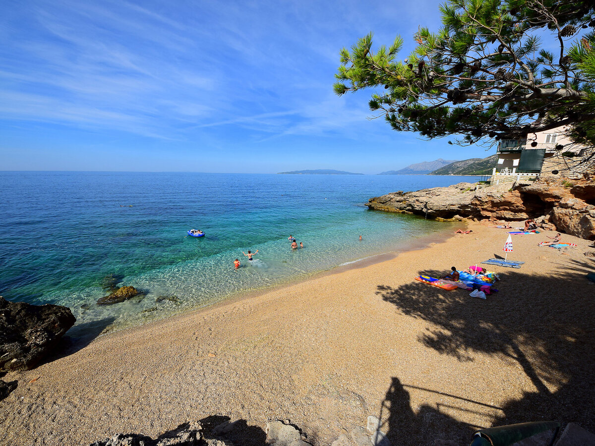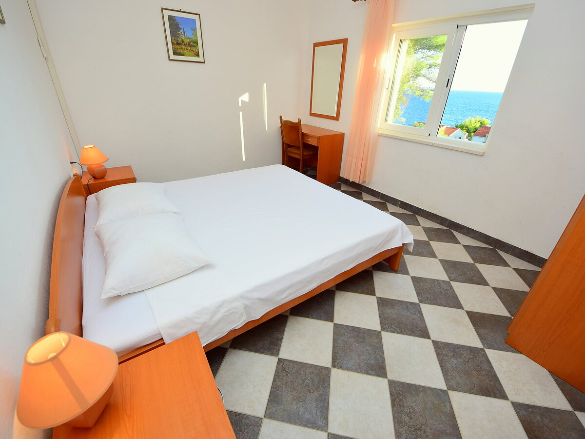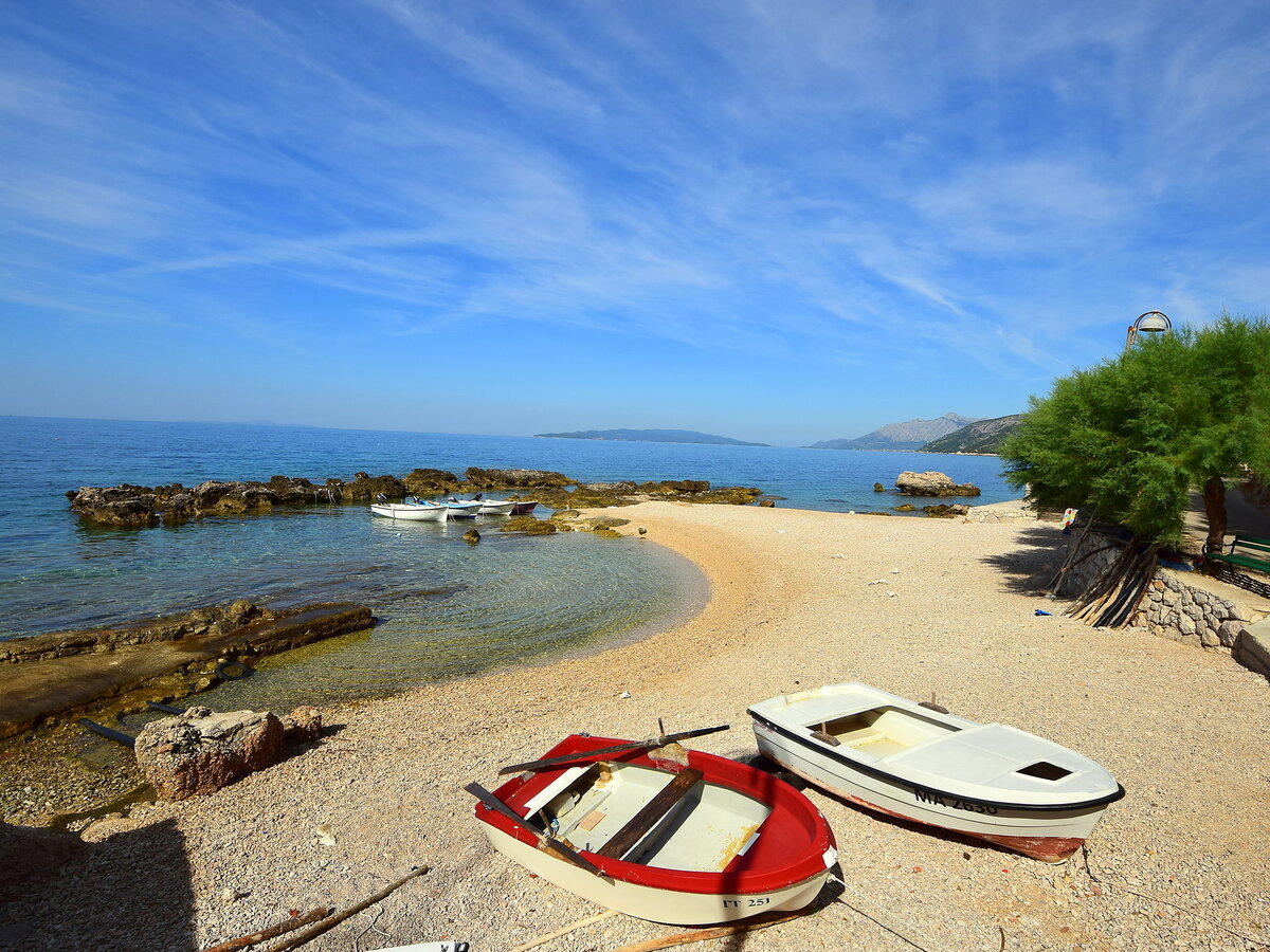 À 5 km du centre de Trstenik en-dehors de la localité, à 4 km du centre de Potomje, situation tranquille, ensoleillée sur un versant, juste au bord de la forêt, à 150 m de la mer, dans une impasse, dans la verdure.