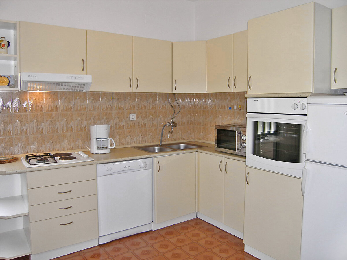 Cuisine ouverte (4 plaques de cuisson, four, lave-vaisselle, micro-ondes, congélateur).