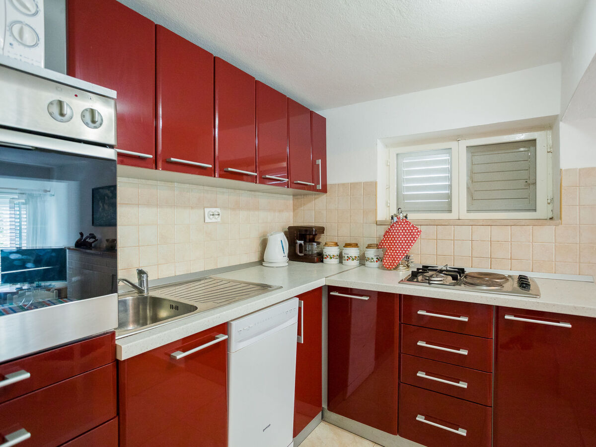 Cuisine ouverte (4 plaques de cuisson, four, lave-vaisselle, congélateur).