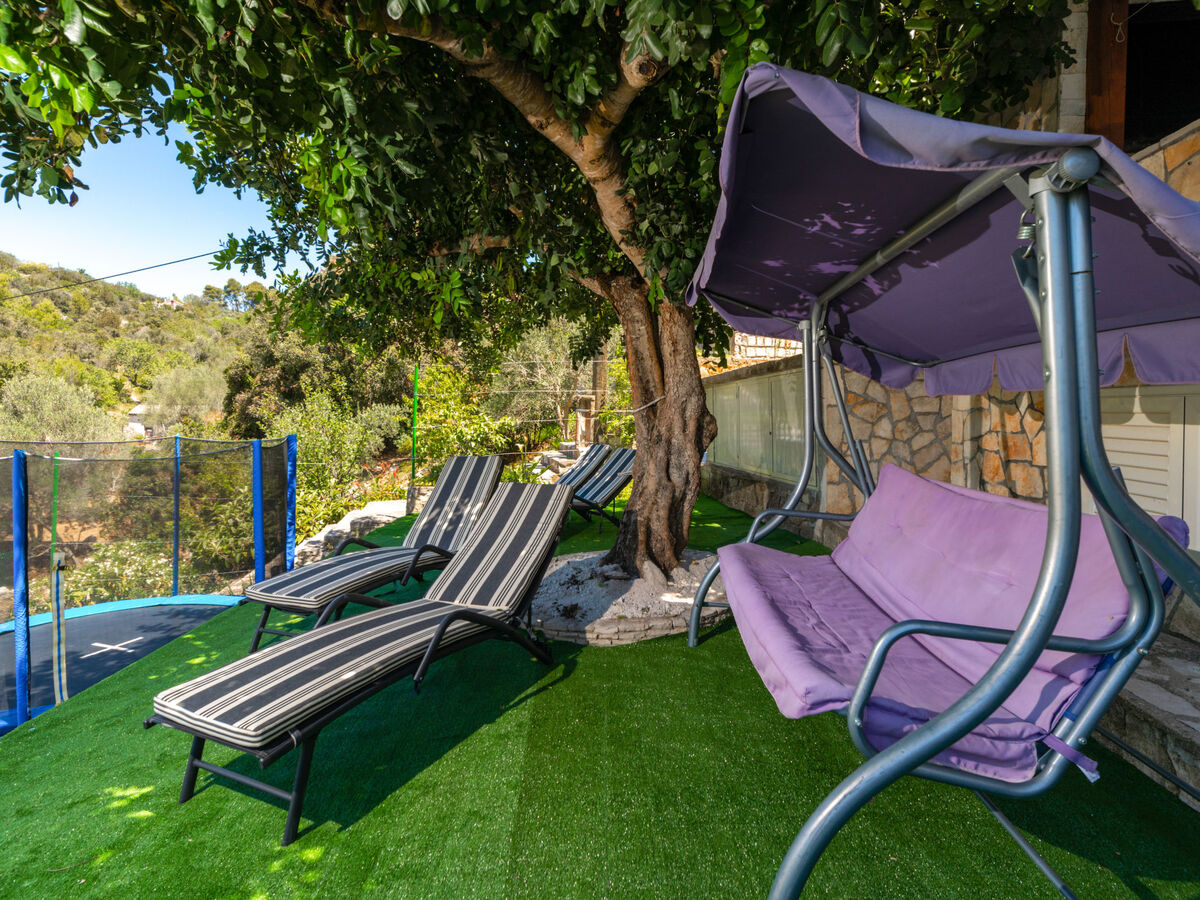 Situation tranquille, ensoleillée sur un versant, à 20 m de la mer, à 20 m de la plage, dans une impasse, dans la verdure, orientée ouest.