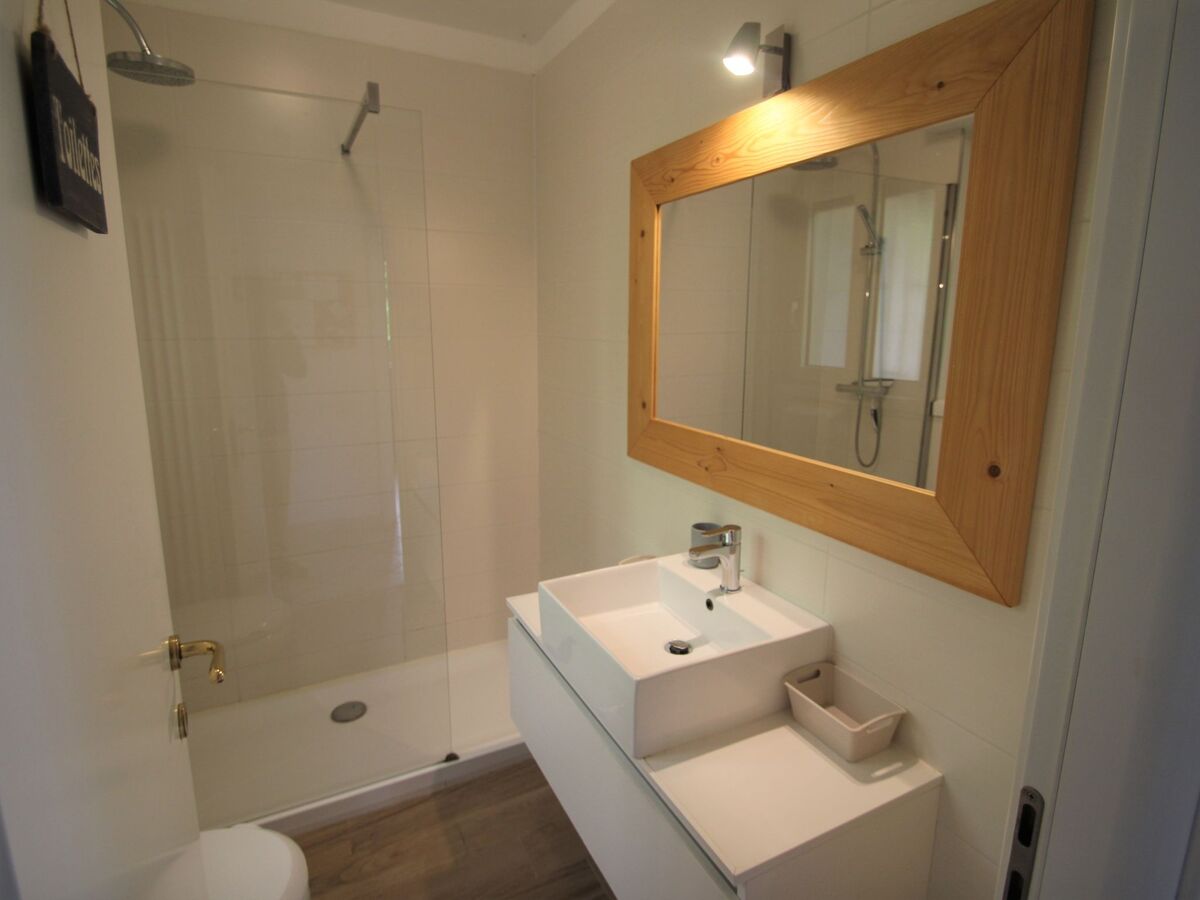 Aménagement moderne et plaisant: 1 grande chambre avec baie vitrée avec 1 lit, 1 lit double et douche/WC.