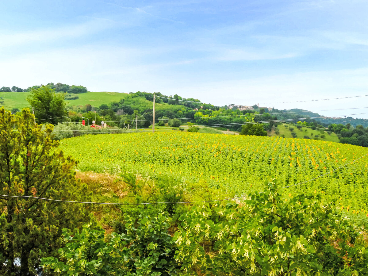 À 15 km du centre de Pesaro en-dehors de la localité, à 1.5 km du centre de Ginestreto, situation surélevée sur une colline, à 15 km de la mer, à 15 km de la plage, dans la verdure.