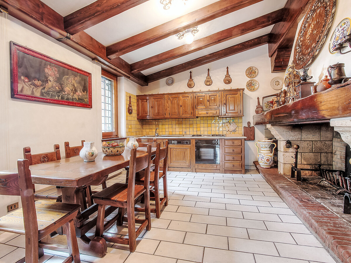 Cuisine 15 m2 (4 plaques de cuisson, four, lave-vaisselle) avec table pour les repas, cheminée, table pour les repas et TV.