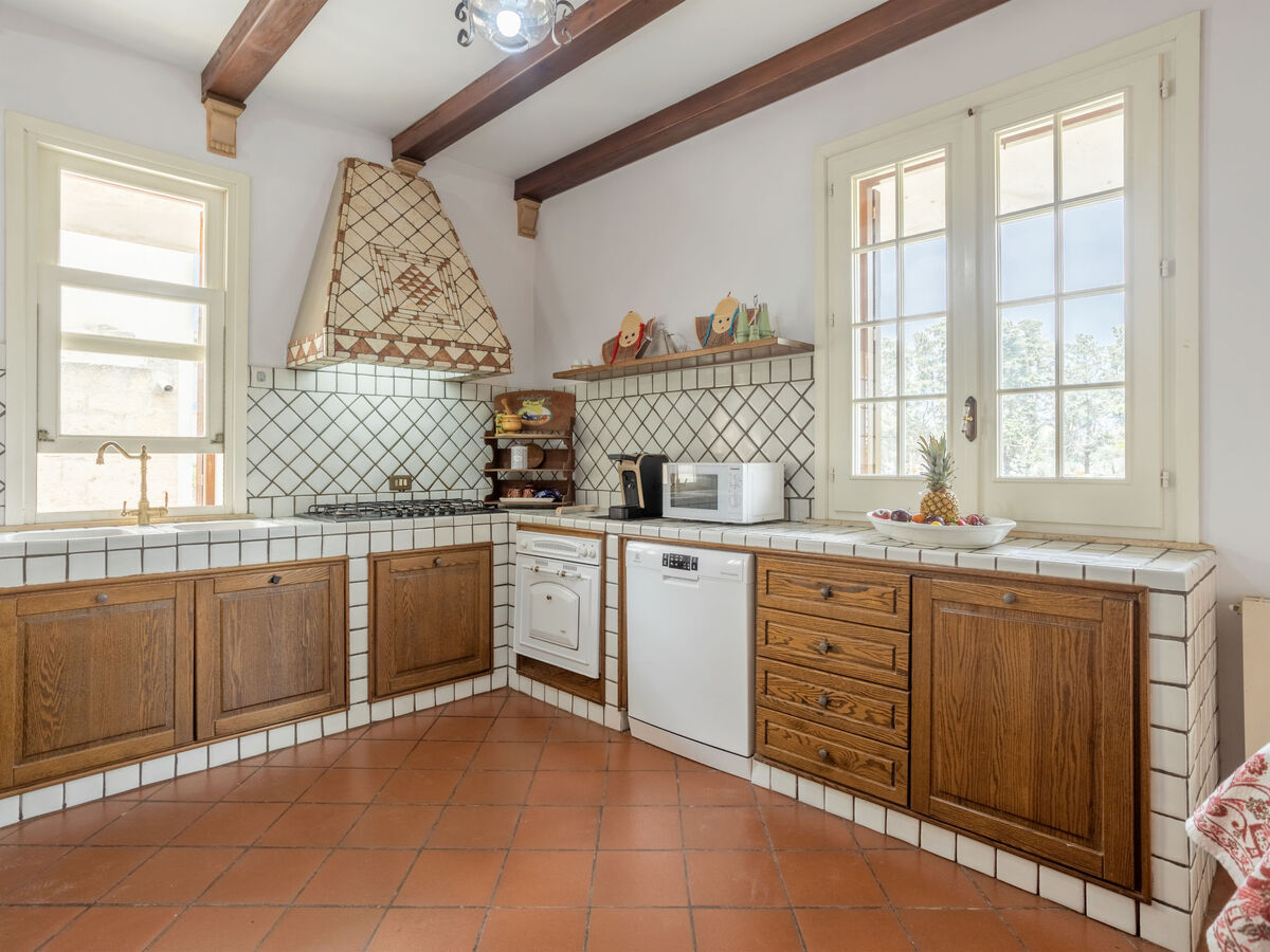 Cuisine ouverte (four, lave-vaisselle, 6 feux, grille-pain, bouilloire électrique, micro-ondes, cafetière électrique) avec ventilateur.