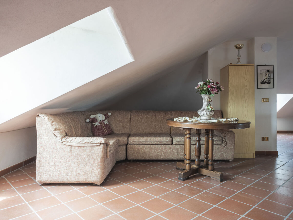 À l'étage supérieur: (escalier en colimaçon) séjour/chambre à coucher 90 m2, mansardé, ouvert, hauteur plafond 130 - 270 cm avec 2 lits et air-conditionné.