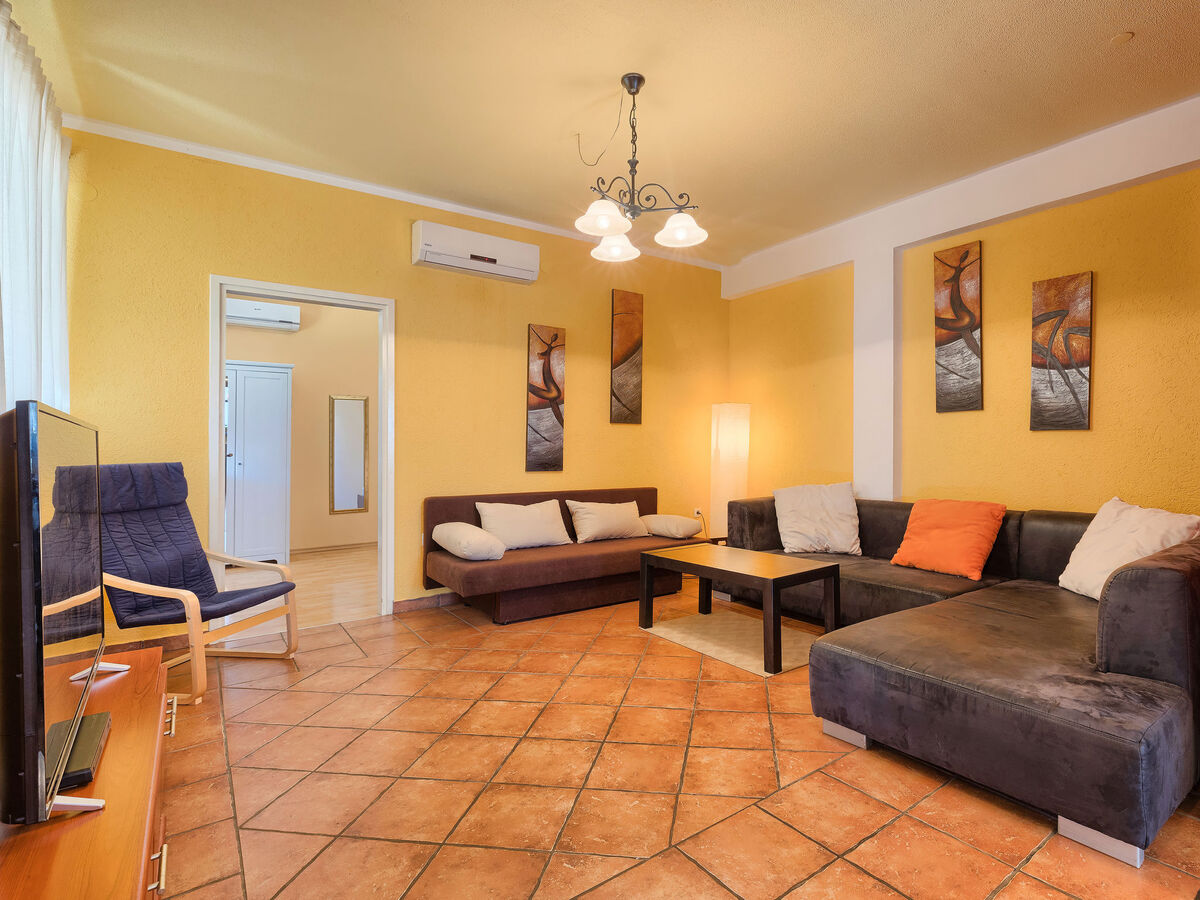 Séjour/salle à manger avec 1 divan-lit double, TV (satellite), DVD et air-conditionné.