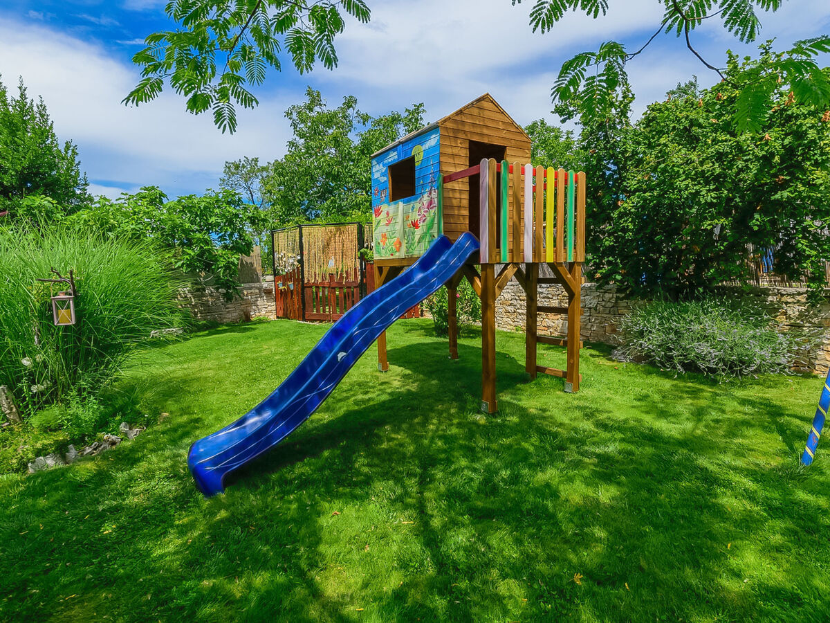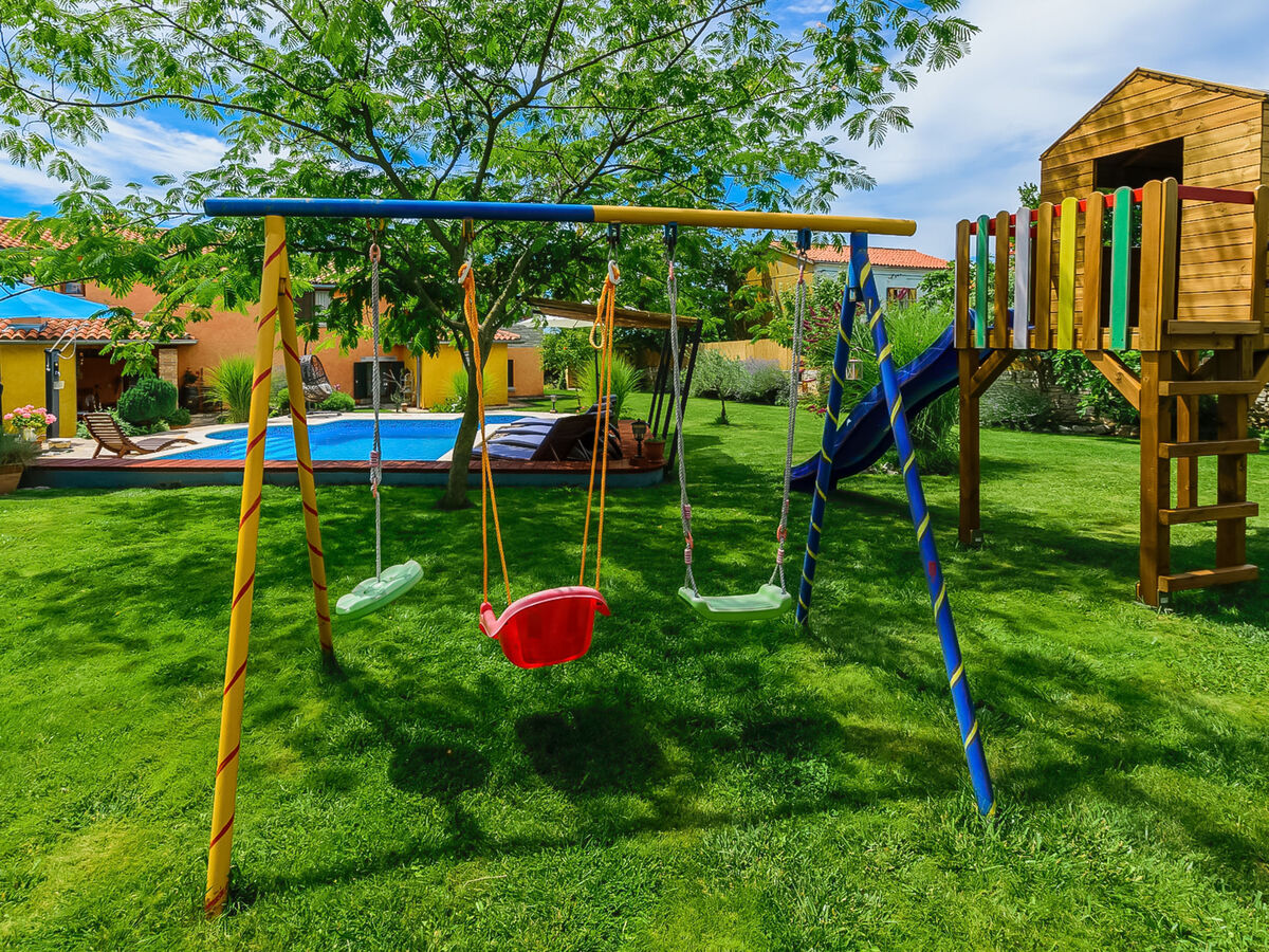 Douche extérieure, espace de jeux pour les enfants (toboggan, balançoire).