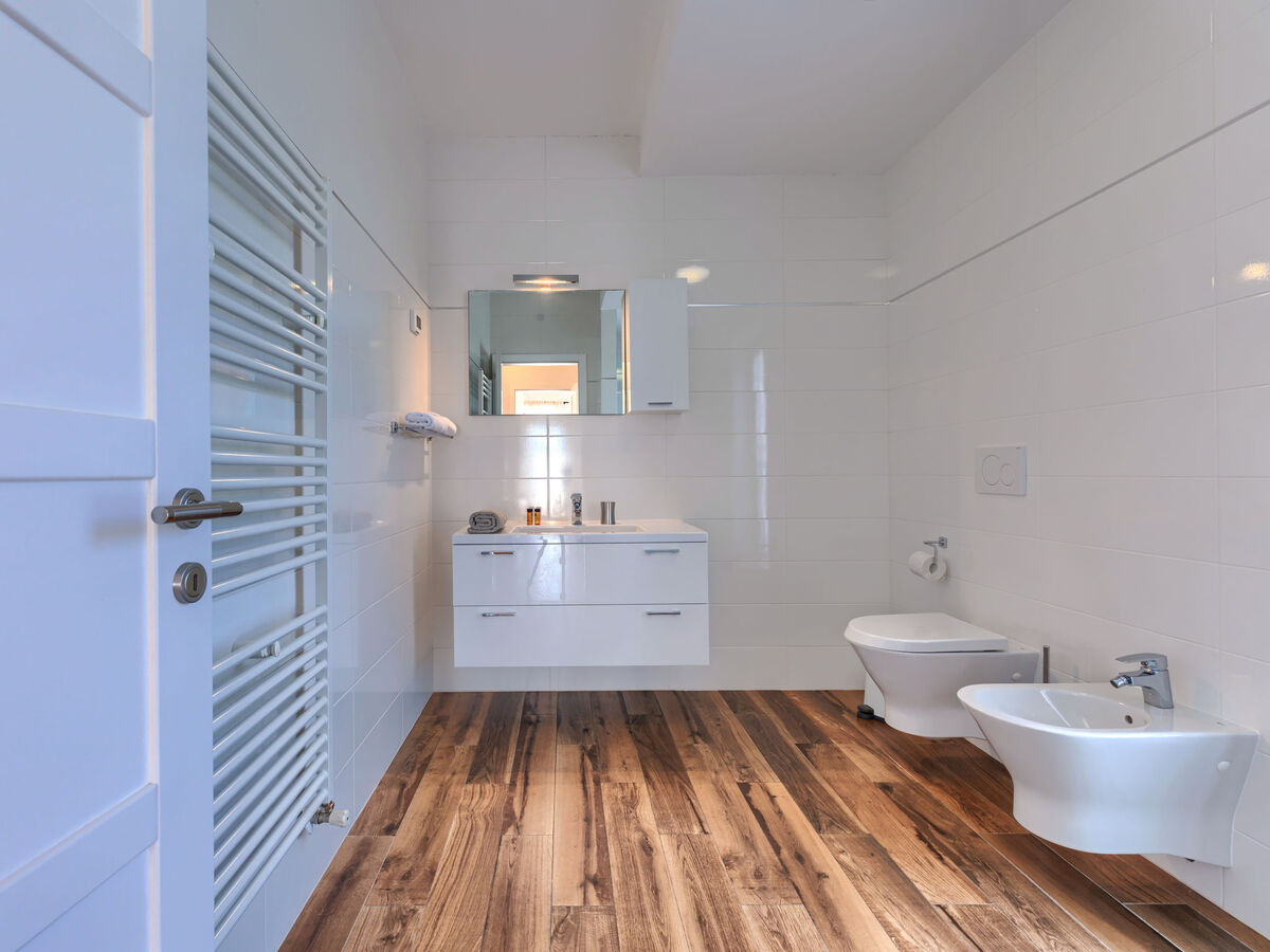 À l'étage supérieur: 1 chambre avec 1 grand-lit (180 cm, longueur 200 cm), bain/bidet/WC et air-conditionné.