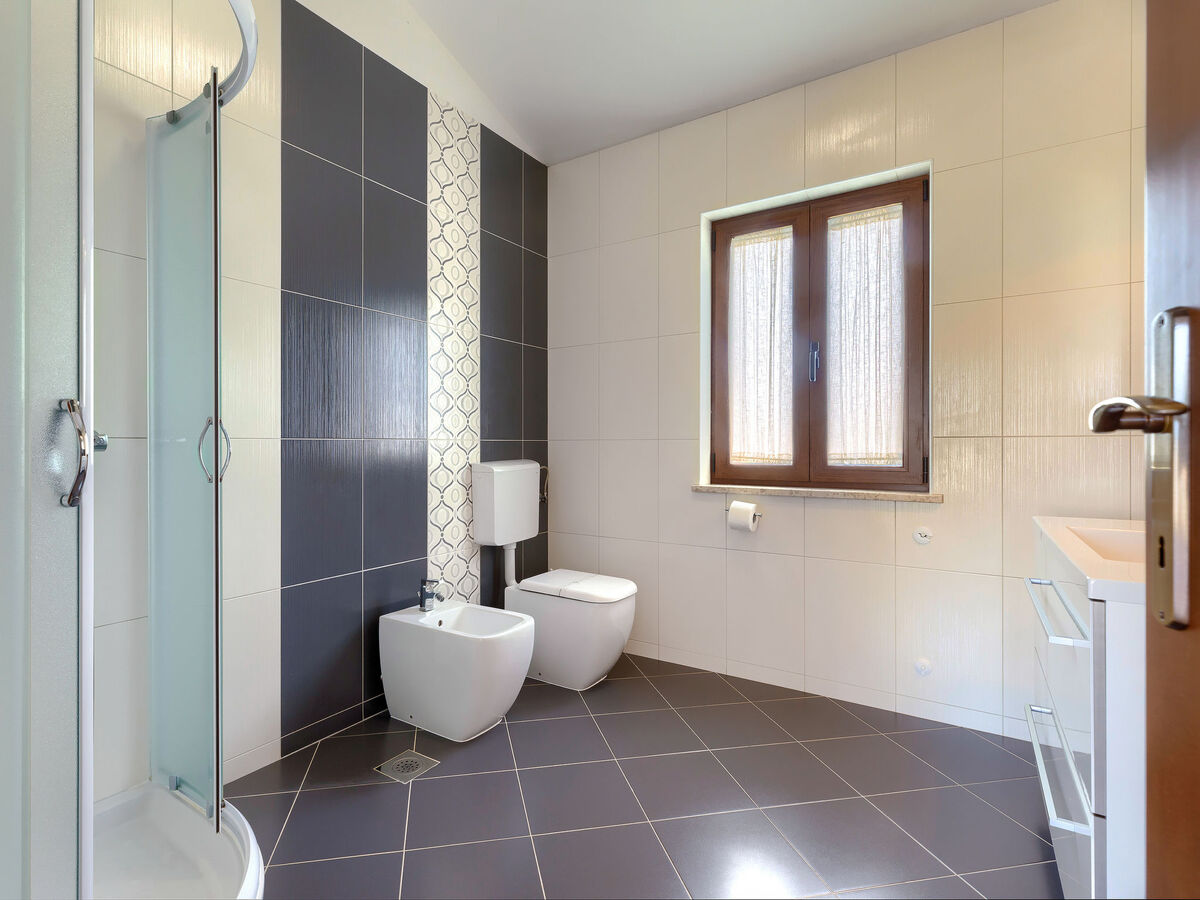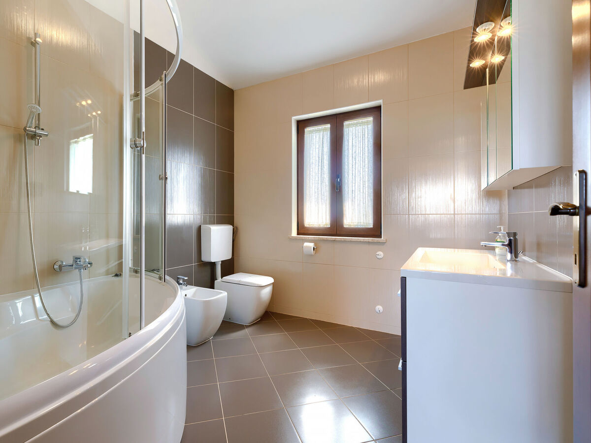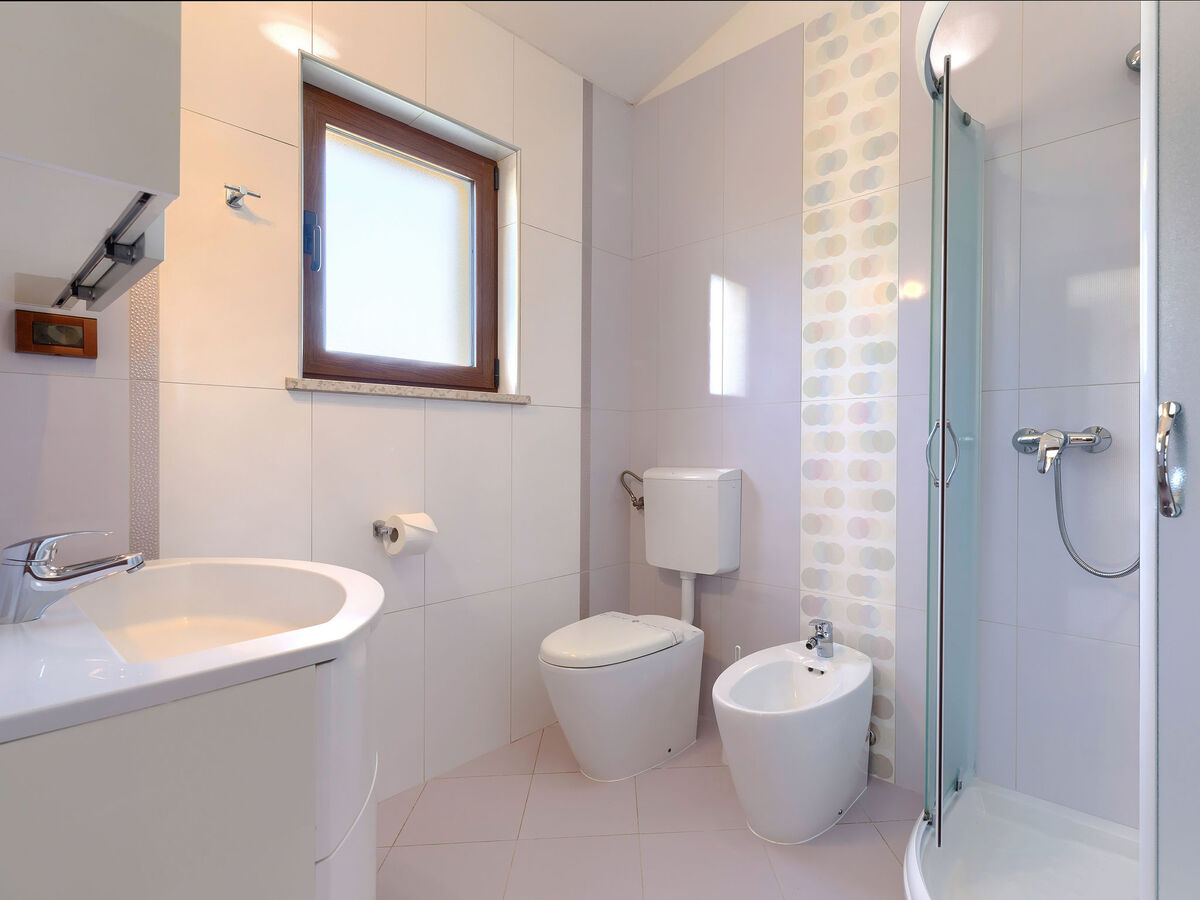 À l'étage supérieur: 1 chambre avec 1 lit double (2 x 90 cm, longueur 200 cm), bain/bidet/WC, avec baignoire d'angle et TV (satellite) (écran plat), air-conditionné.