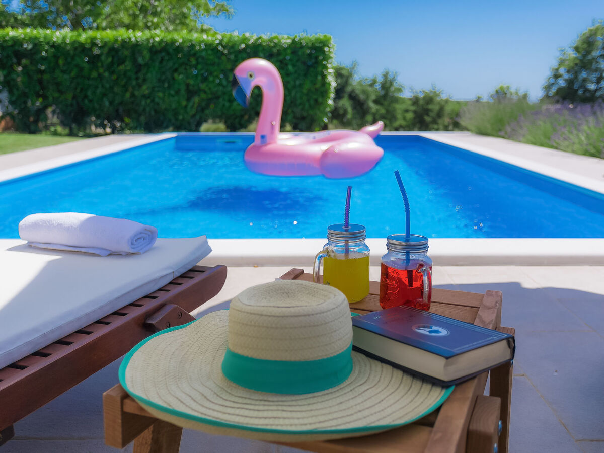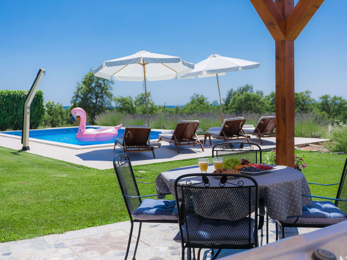 A usage privé: terrain 500 m2 (clôturé), jardin, piscine rectangulaire (9 x 4 m, 40 m2, profondeur 140 cm, disponibilité saisonnière: 28.Mar.