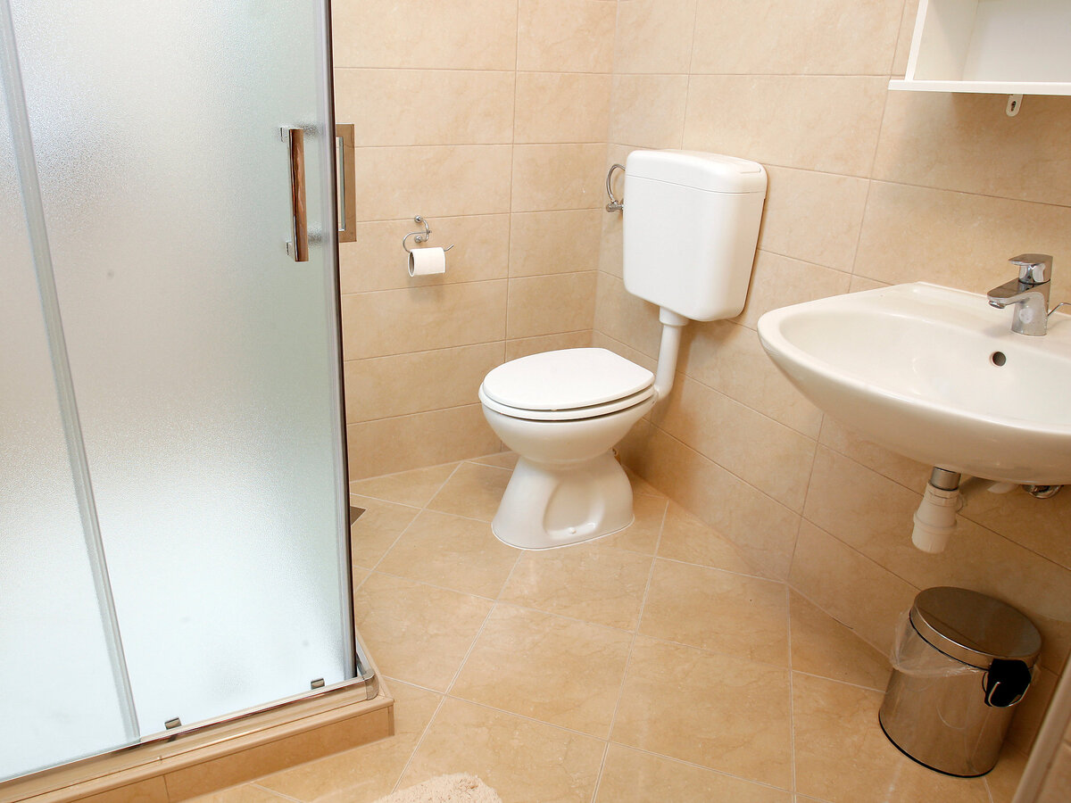 À l'étage supérieur: 1 chambre, mansardée hauteur plafond 100 - 230 cm avec 1 lit double (2 x 90 cm, longueur 200 cm), douche/WC et TV (satellite) (écran plat), air-conditionné.