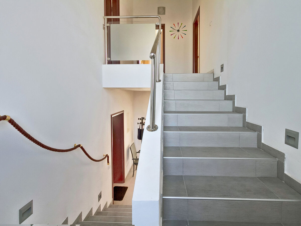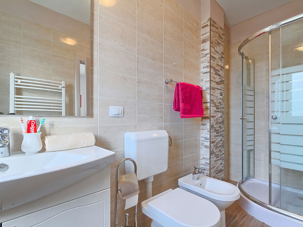 À l'étage supérieur: 1 chambre avec 1 grand-lit (180 cm, longueur 200 cm), douche/bidet/WC, TV (satellite) et air-conditionné.