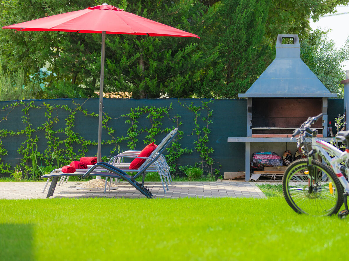 A usage privé: terrain 570 m2 (clôturé), jardin, piscine rectangulaire (25 m2, profondeur 140 cm, disponibilité saisonnière: 27.Avr.