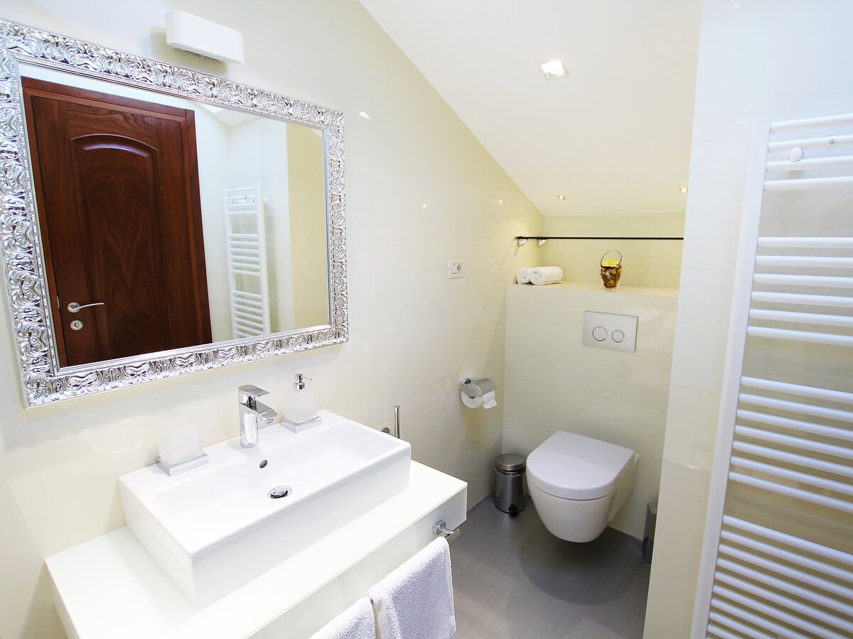 Sous le toit: 1 chambre, mansardée hauteur plafond 145 - 290 cm avec fenêtre sous le toit avec 1 lit double (2 x 90 cm, longueur 200 cm), douche/WC et TV (écran plat), air-conditionné.