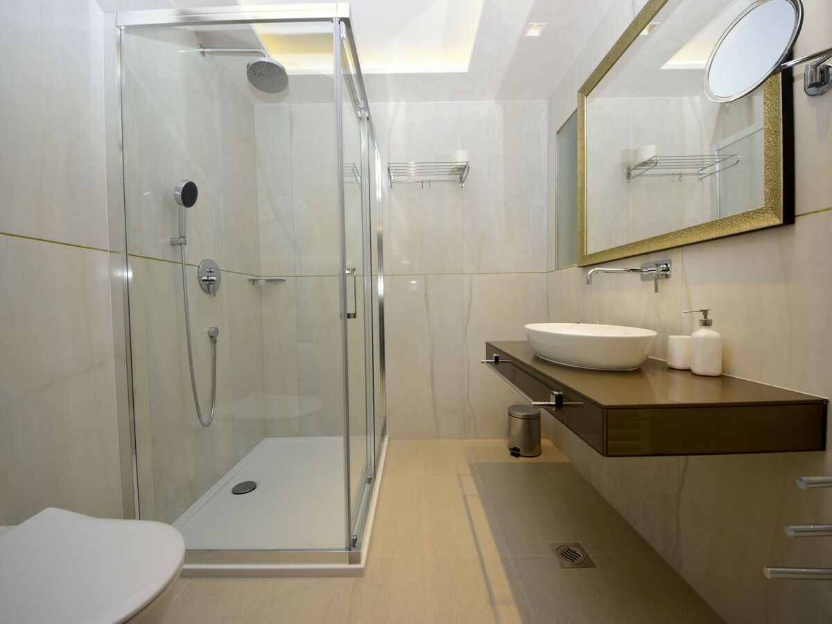 1 chambre avec 1 grand-lit (160 cm, longueur 200 cm), douche/WC et TV (satellite) (écran plat), air-conditionné.