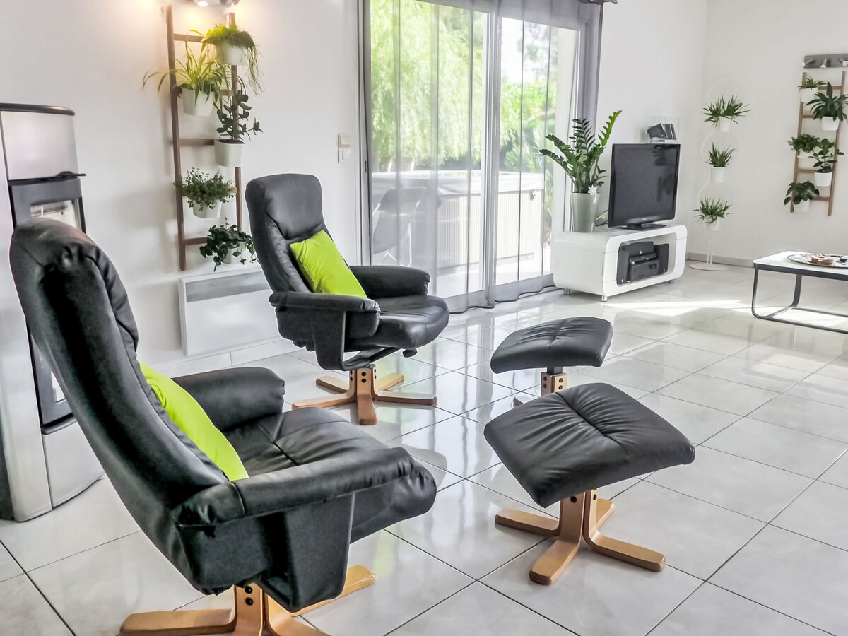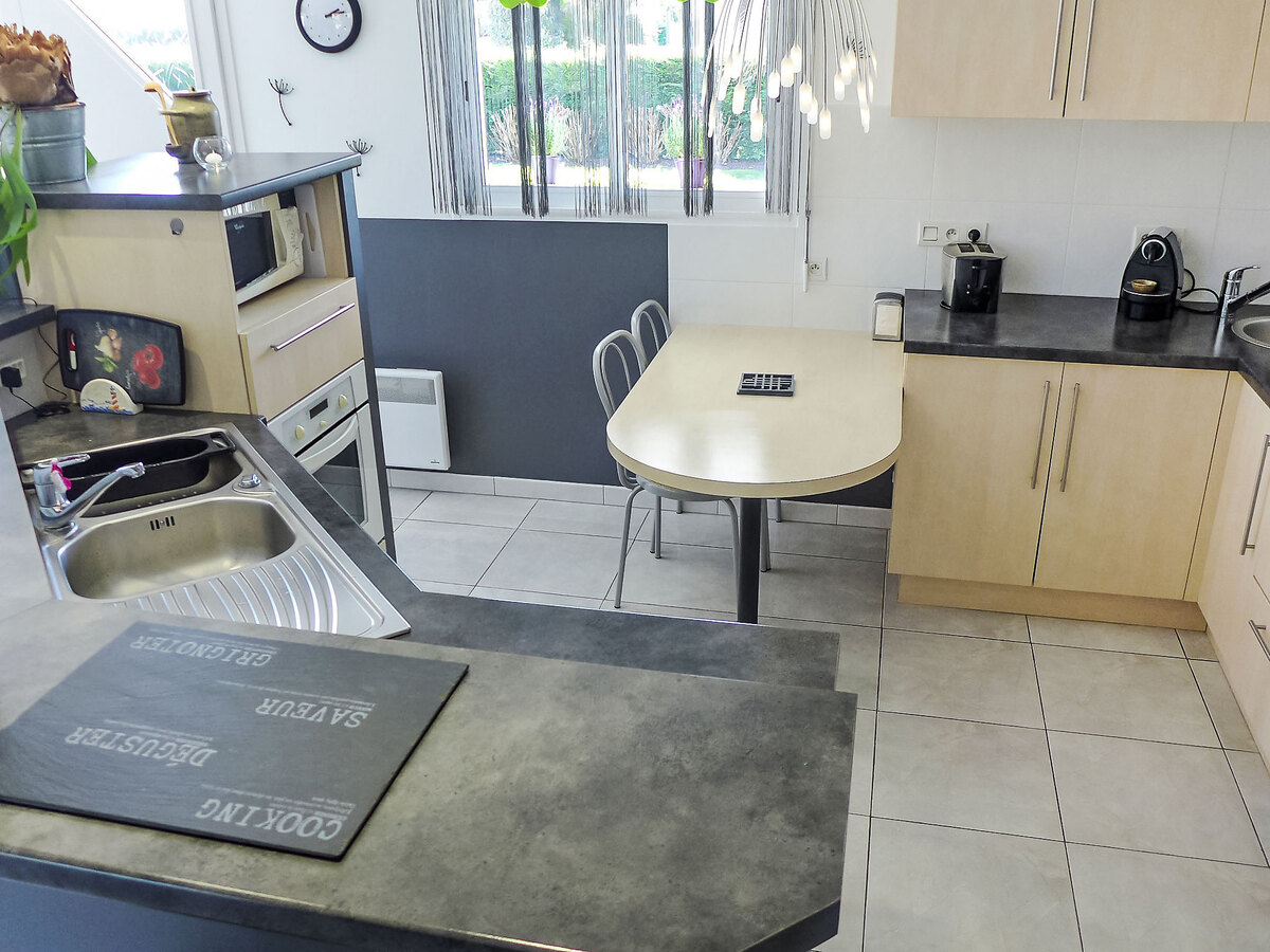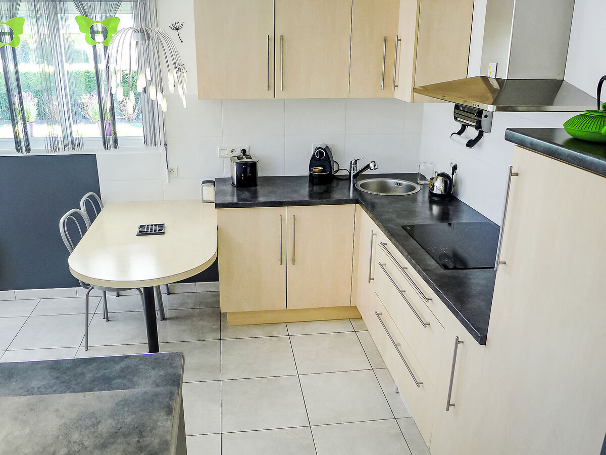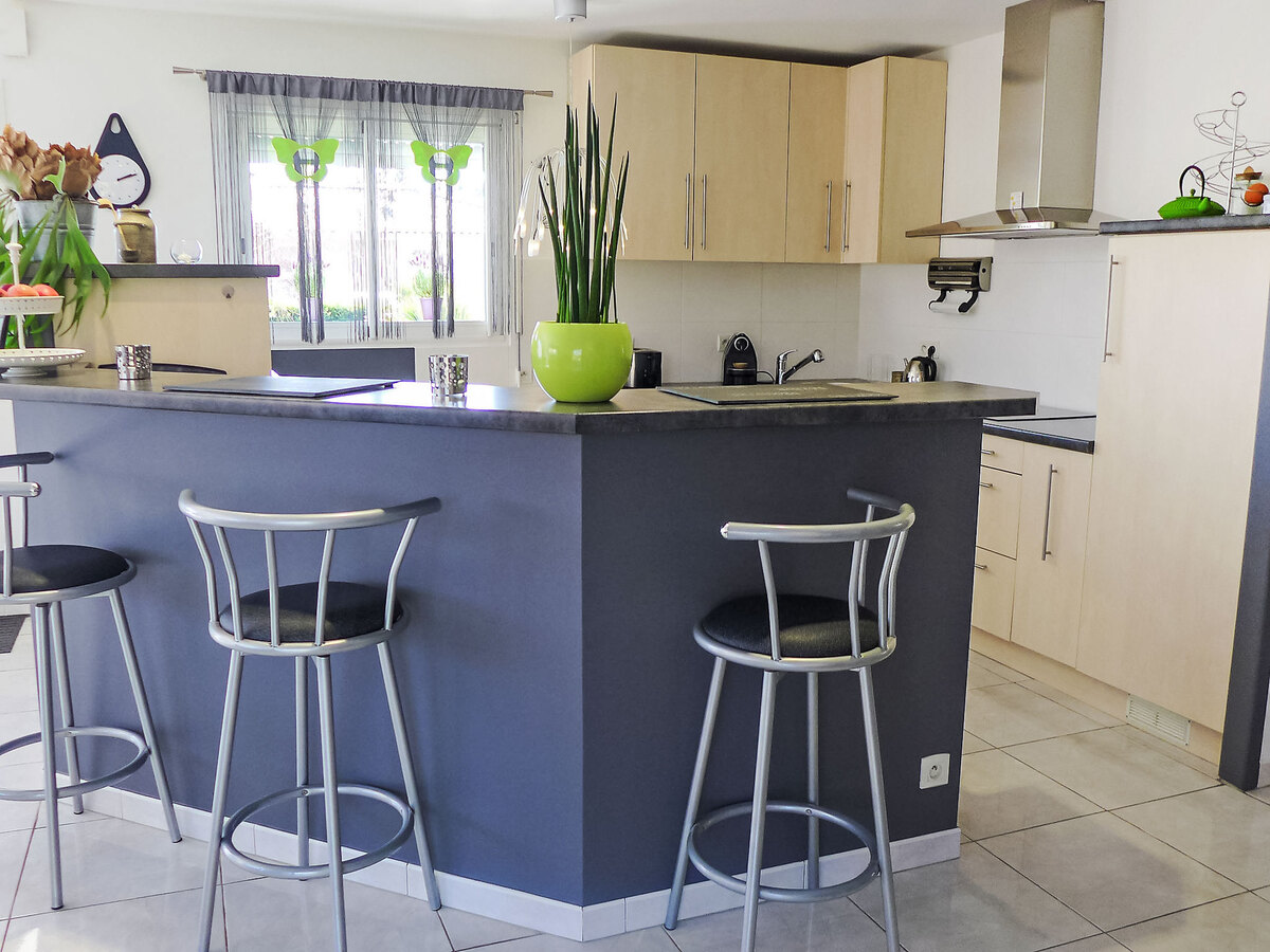 Cuisine ouverte (four, lave-vaisselle, 3 plaques à induction, micro-ondes, congélateur, cafetière électrique).