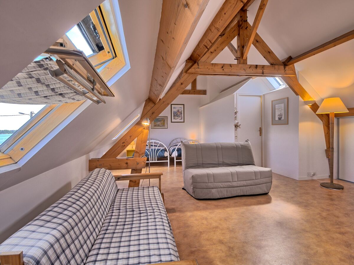 À l'étage supérieur: (escalier extérieur) 1 chambre, mansardée avec 2 lits (90 cm, longueur 190 cm), 1 divan-lit et douche/WC.