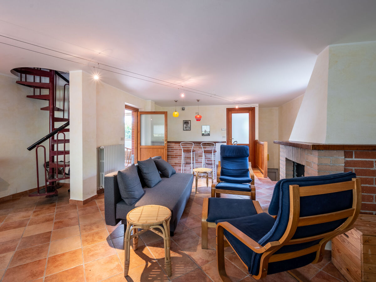 À l'étage inférieur: (escalier en colimaçon) séjour avec cheminée (uniquement à titre de décoration), TV (satellite).