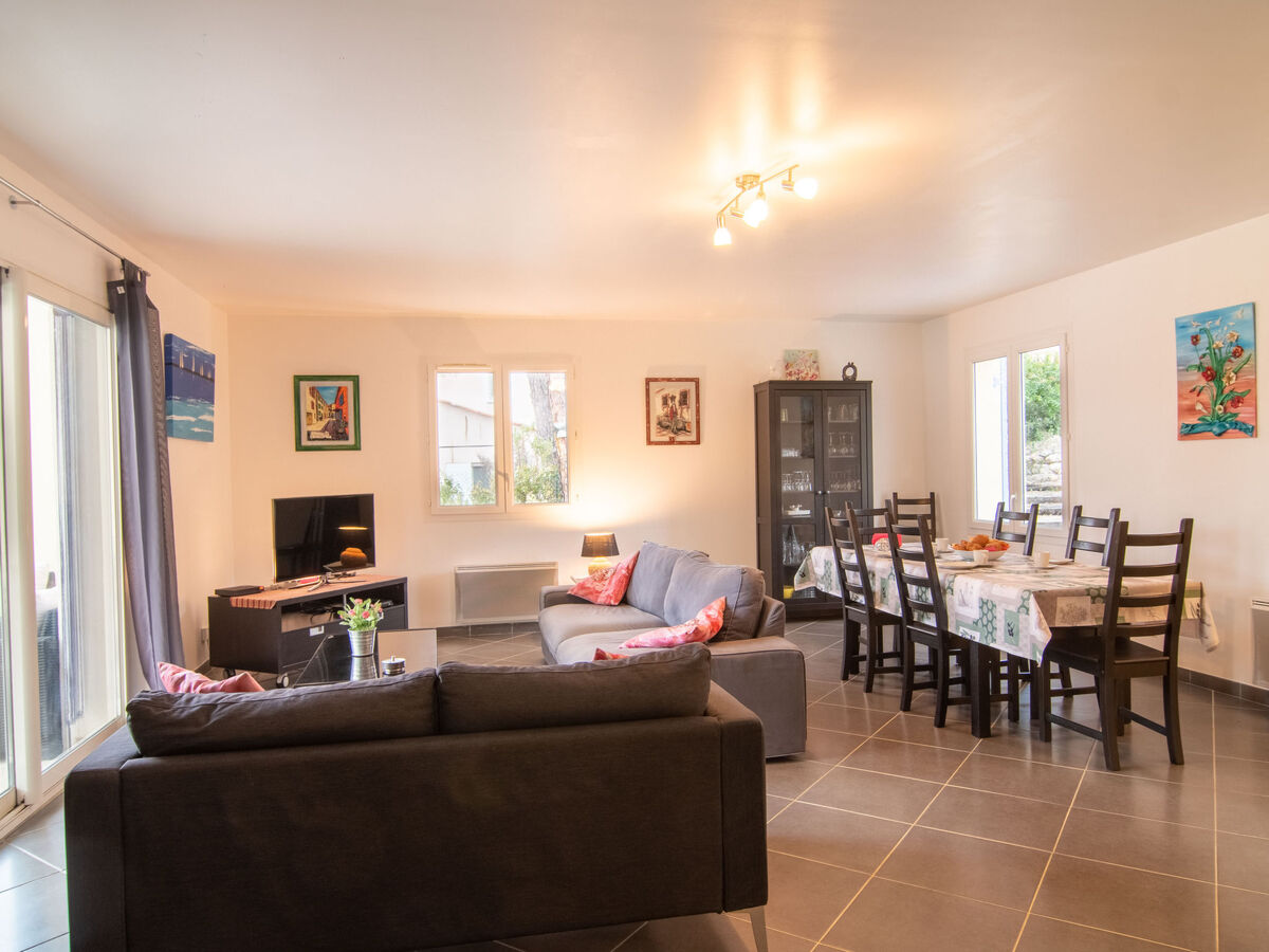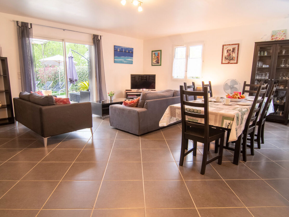 Aménagement agréable et moderne: séjour/salle à manger avec table pour les repas, TV (satellite), chaîne stéréo, DVD et poêle à bois.