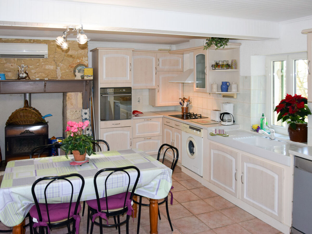 Cuisine (four, lave-vaisselle, 2 plaques à induction, 2 feux, grille-pain, bouilloire électrique, micro-ondes, congélateur, cafetière électrique) avec poêle à bois et air-conditionné.