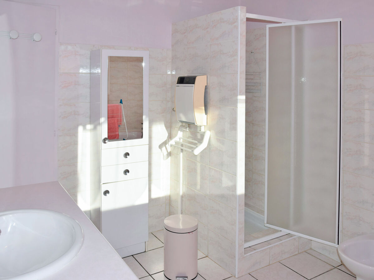 Douche extérieure, terrasse, meubles de jardin, espace barbecue.