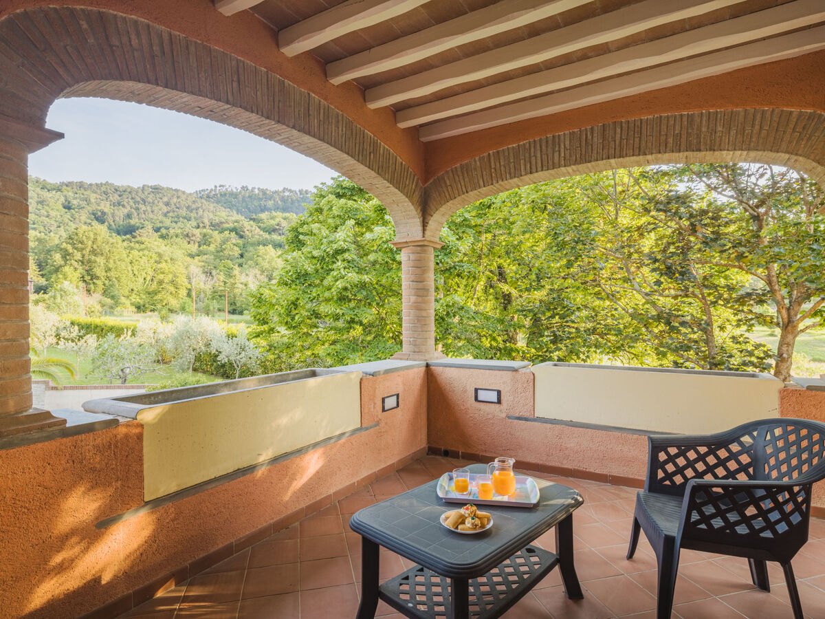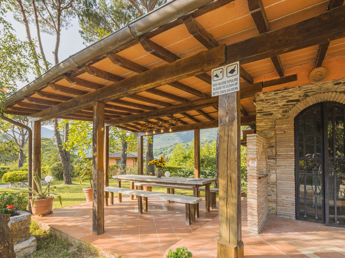 À l’extérieur, une terrasse couverte, une terrasse avec pergola, et une terrasse équipée de meubles de jardin donnent une vue panoramique sur les alentours. Un barbecue transportable, un four à pizza et une cuisine d’été (avec plan de cuisson) y sont installés. L’espace piscine est composé ‘un bassin de 10 X 5 m, de chaises longues, de bains de soleil, et d’une douche extérieure. Un terrain de 2000 m² où sont installés des chevaux est accessible. Un parking est également disponible sur ce terrain.
