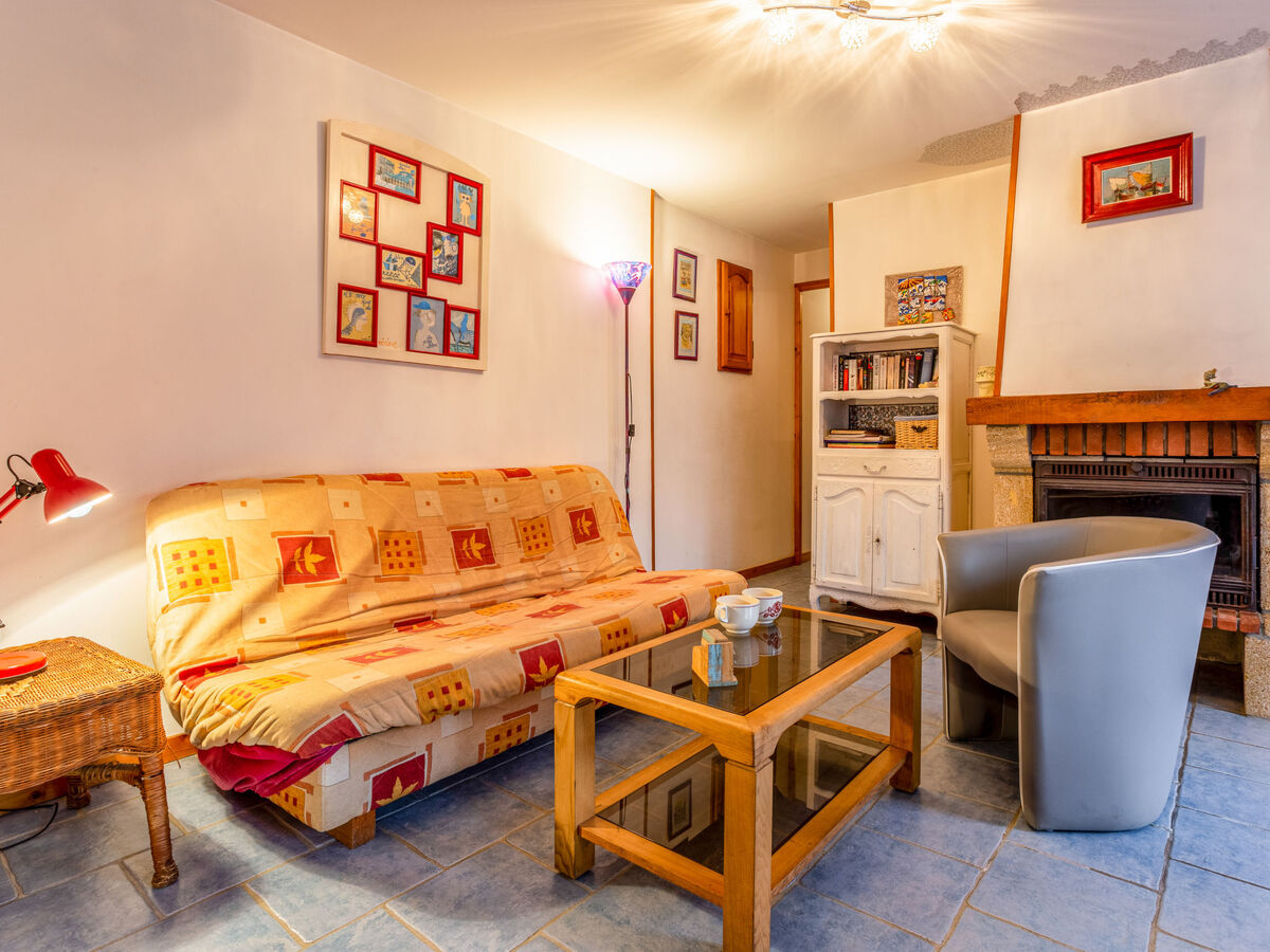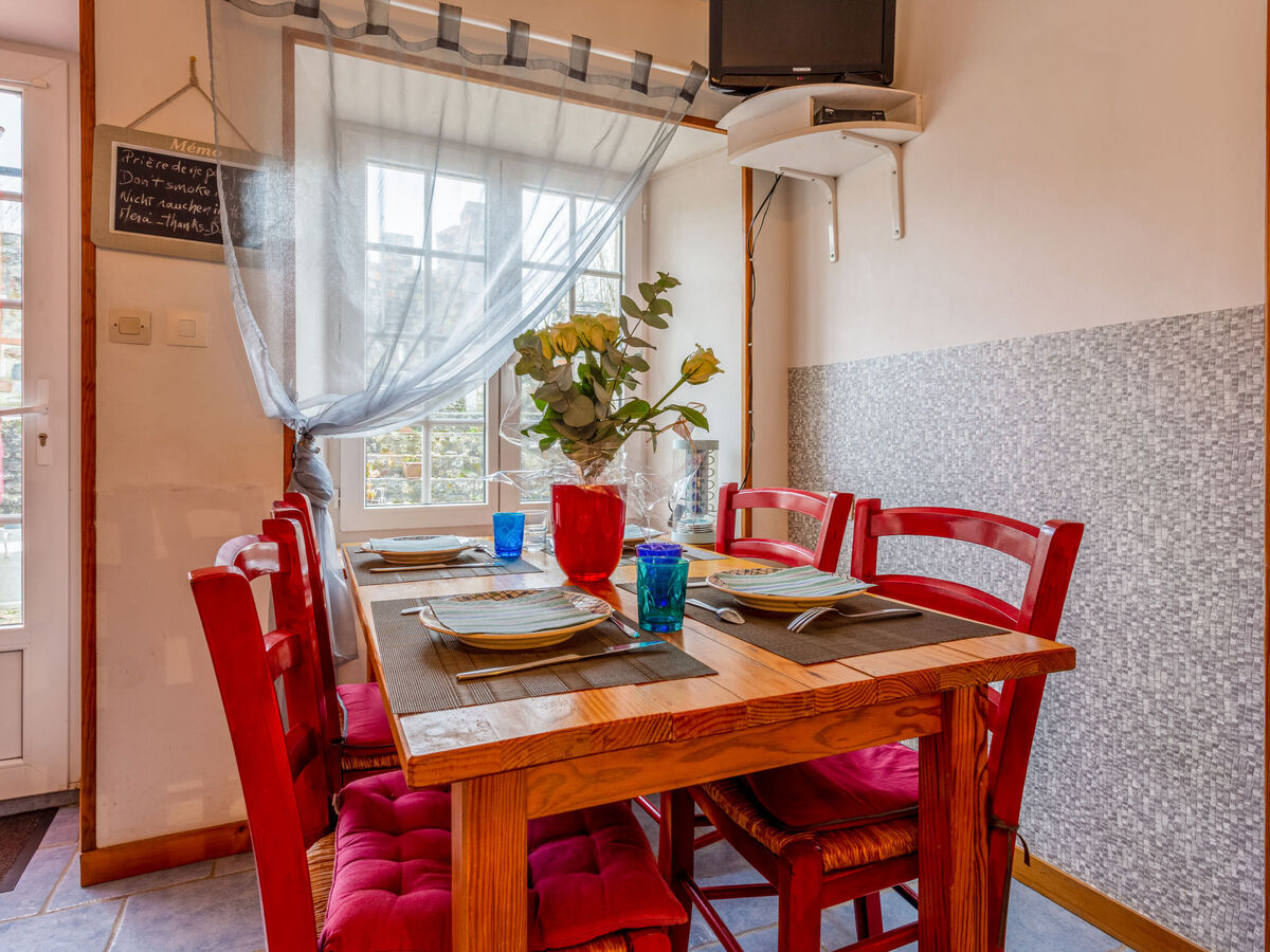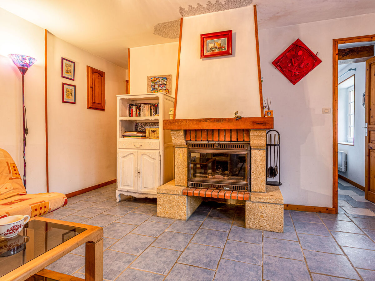 Clair, aménagement plaisant: séjour/salle à manger avec cheminée, table pour les repas et TV (satellite).