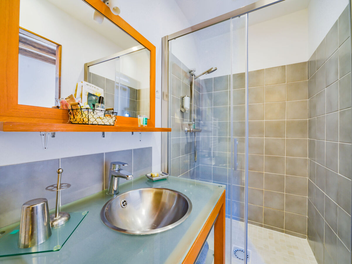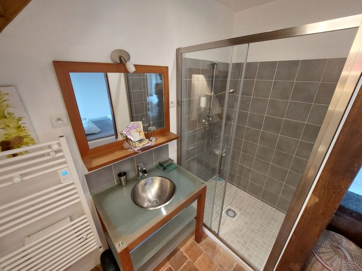 Aménagement agréable et plaisant: 1 chambre avec 1 grand-lit (140 cm, longueur 190 cm), douche/WC.