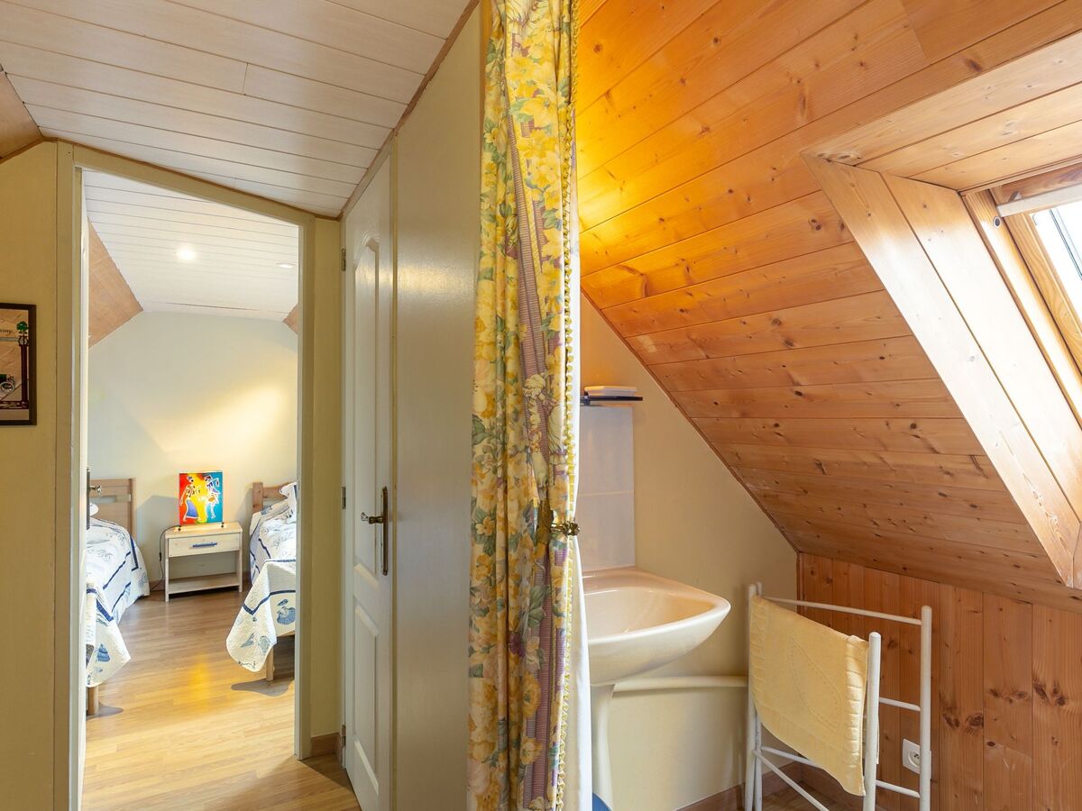 À l'étage supérieur: 1 chambre, mansardée hauteur plafond 180 - 200 cm avec 2 lits (90 cm, longueur 160 cm).