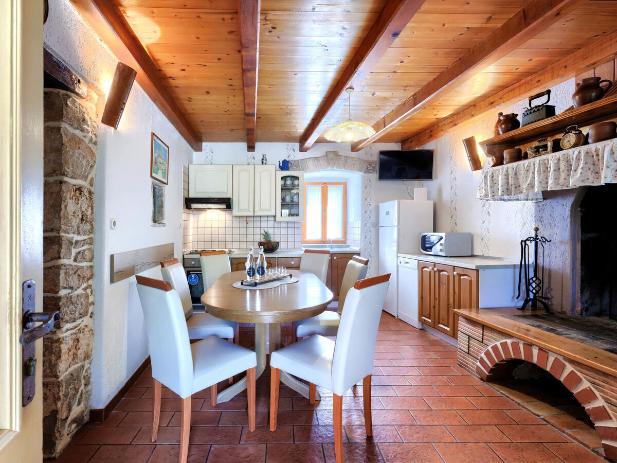 Cuisine ouverte (4 plaques de cuisson, four, lave-vaisselle, grille-pain, bouilloire électrique, micro-ondes, congélateur, cafetière électrique) avec cheminée et table pour les repas.