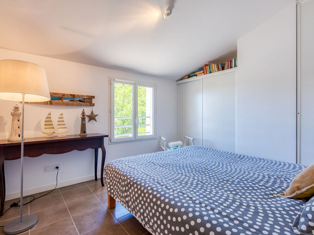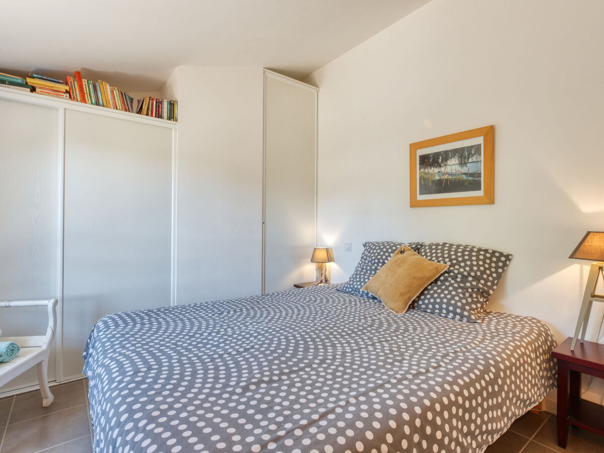 À l'étage supérieur: 1 chambre, mansardée avec 1 grand-lit (160 cm, longueur 200 cm).