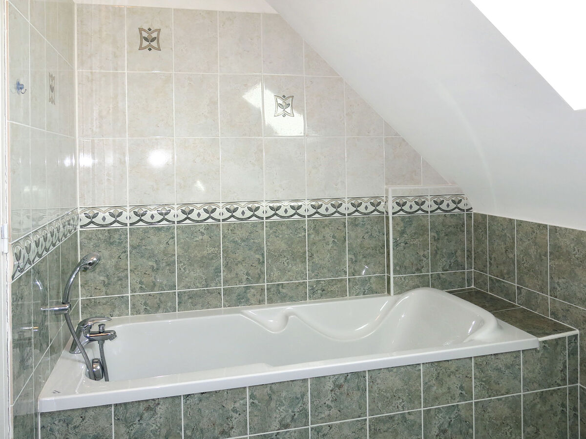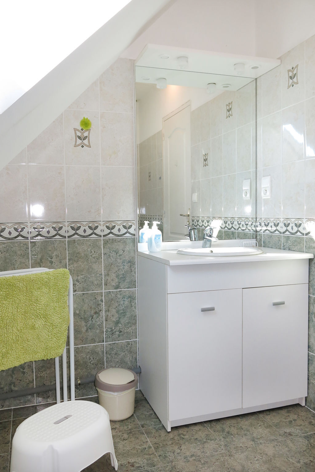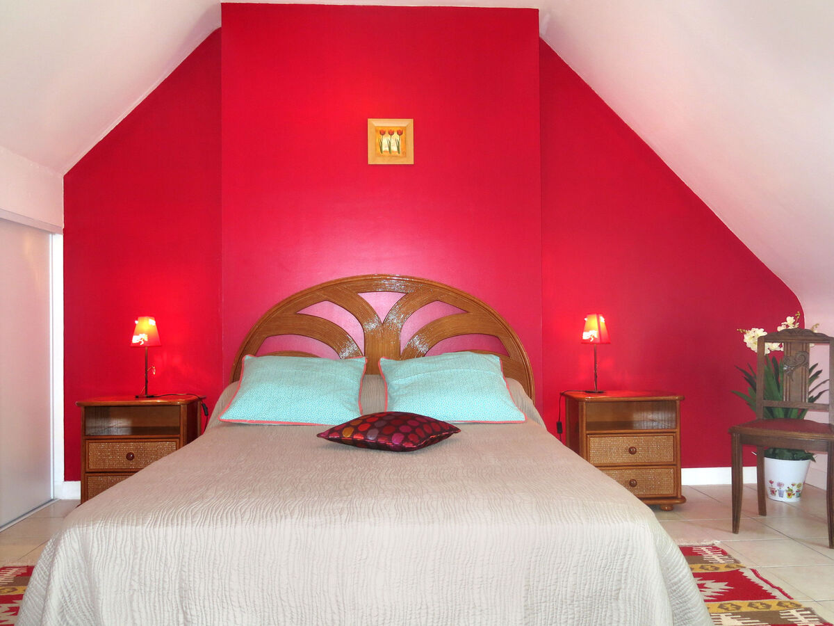 À l'étage supérieur: 1 chambre, mansardée avec 1 grand-lit (140 cm, longueur 190 cm).