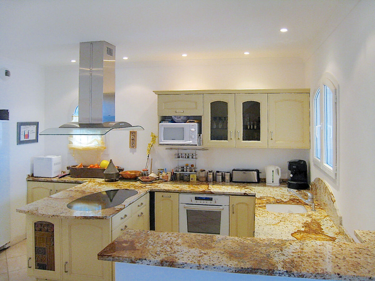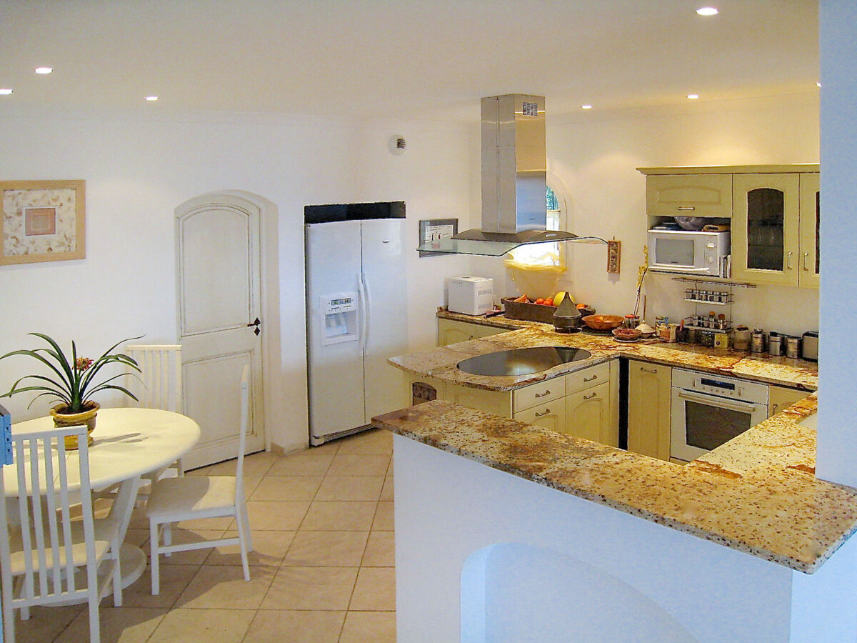 Cuisine ouverte (lave-vaisselle, 4 plaques vitrocéramiques, micro-ondes, congélateur, cafetière électrique) avec table pour les repas.