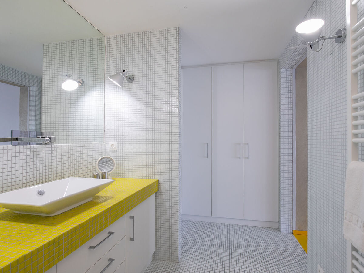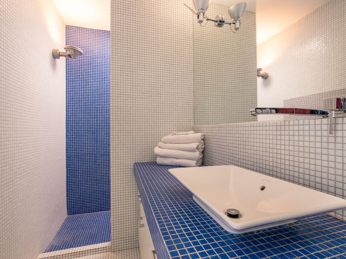 Clair, aménagement confortable et de bon goût: 1 chambre avec 1 grand-lit (160 cm), douche.