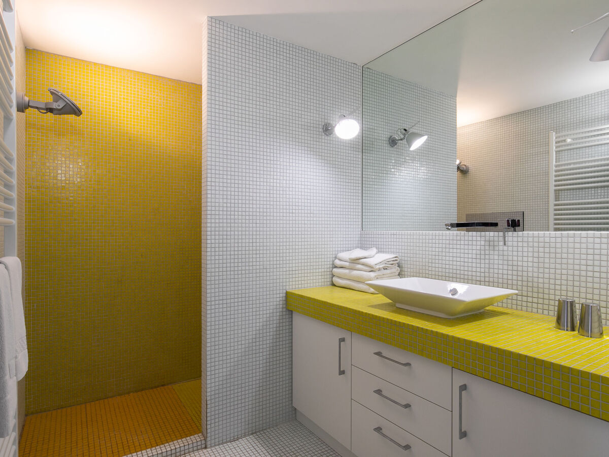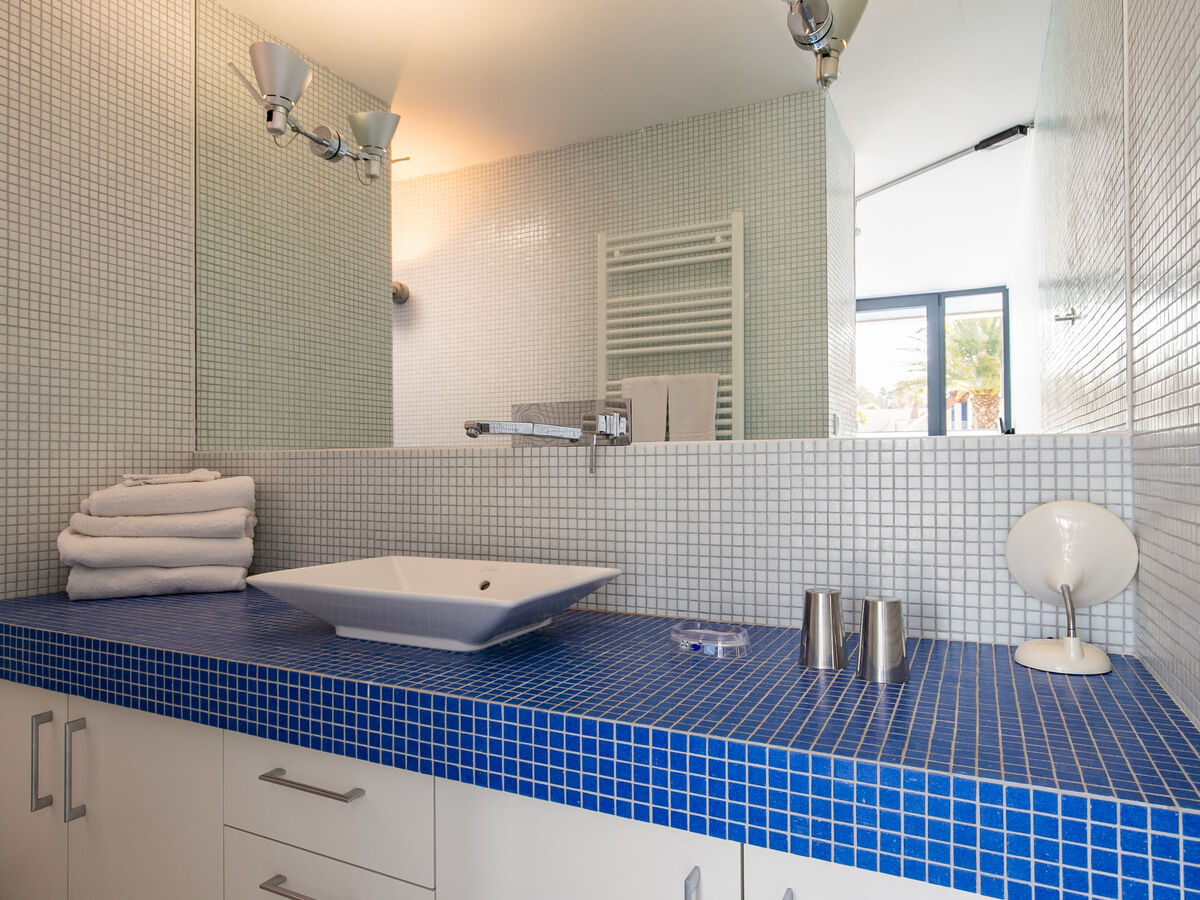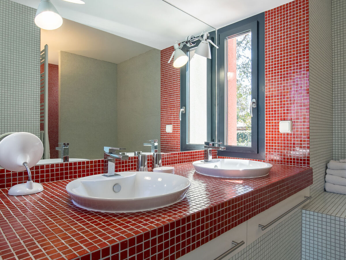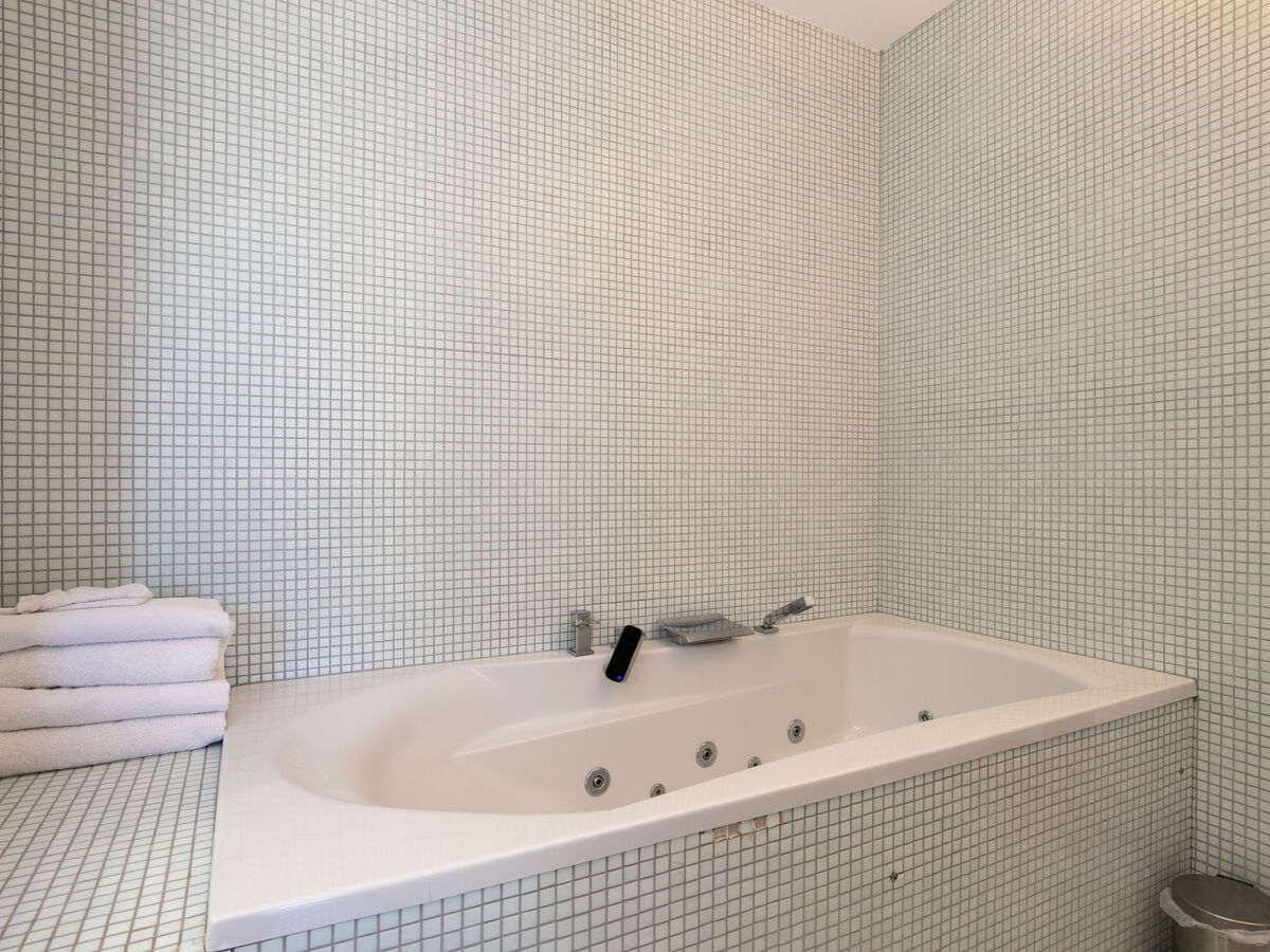 1 chambre avec 1 grand-lit (160 cm), WC séparés, douche, double vasque et bain à remous .