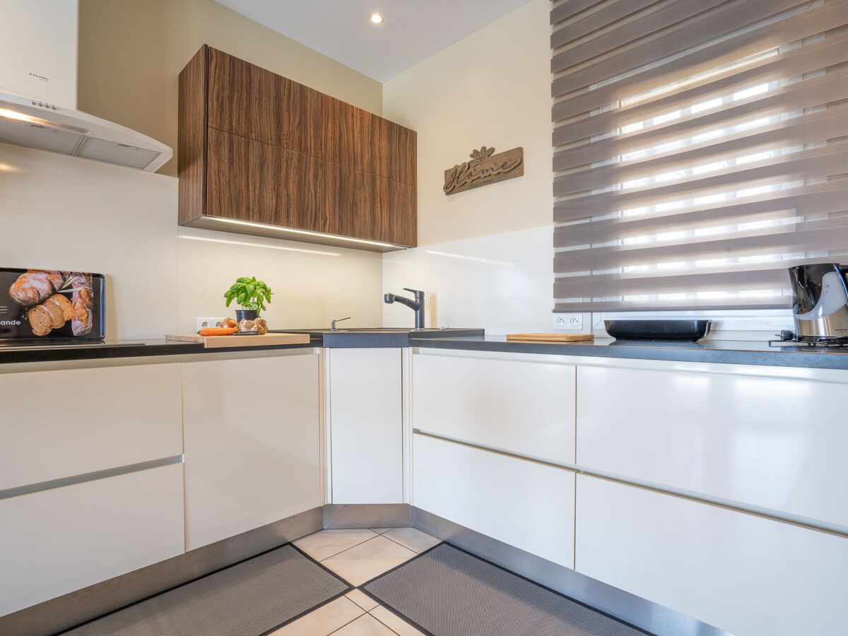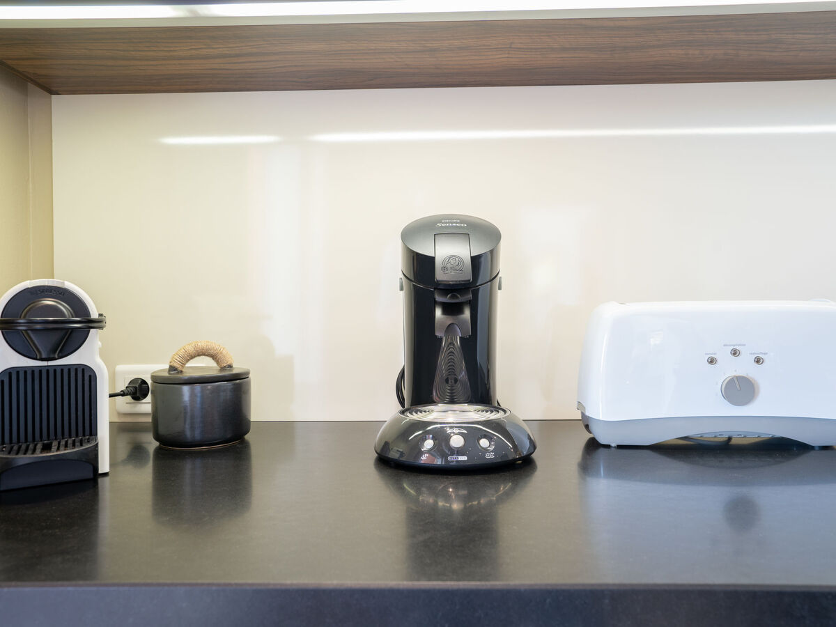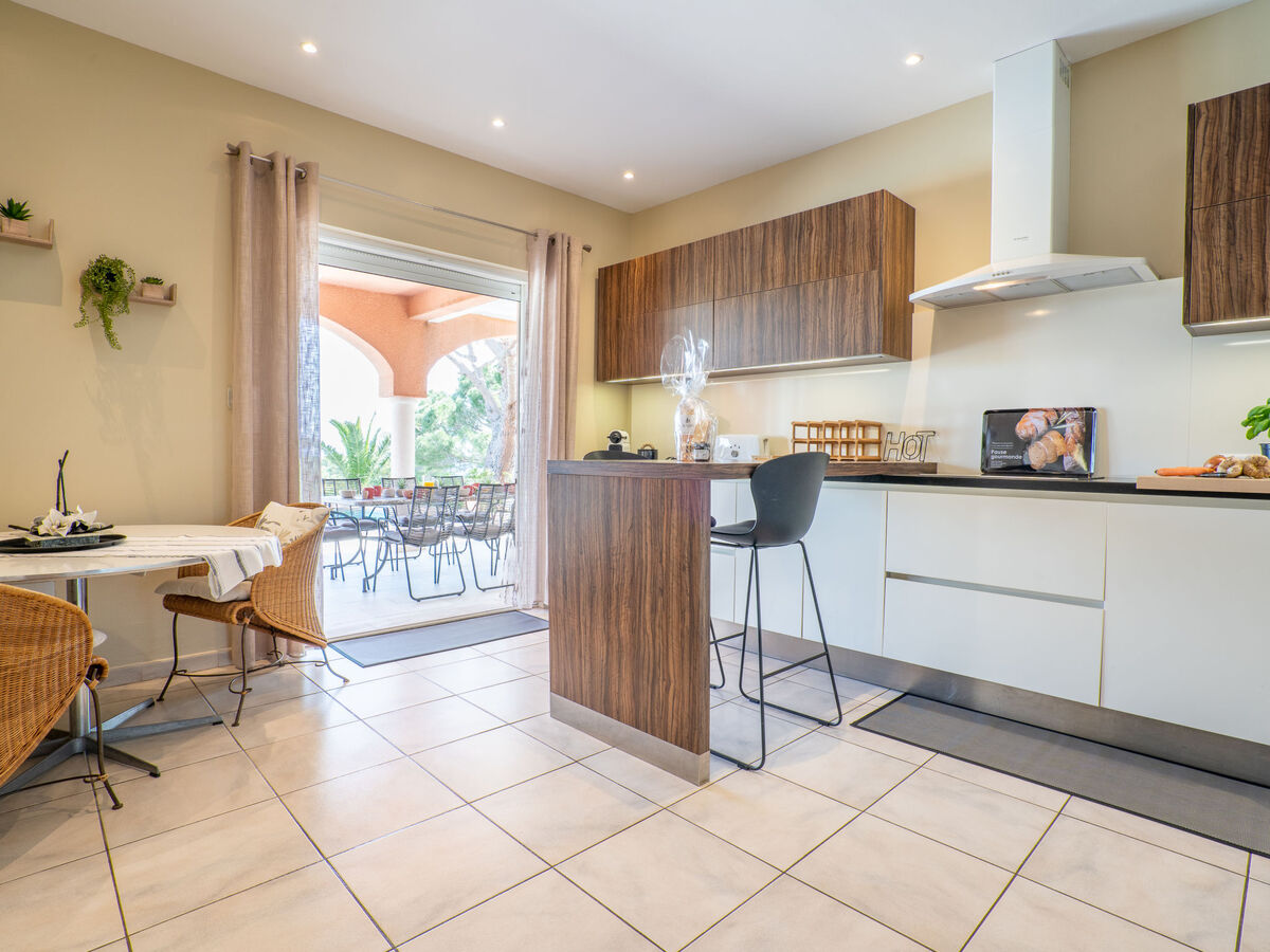 Cuisine (four, lave-vaisselle, 4 plaques vitrocéramiques, grille-pain, bouilloire électrique, micro-ondes, congélateur, cafetière électrique) avec petite table pour les repas.
