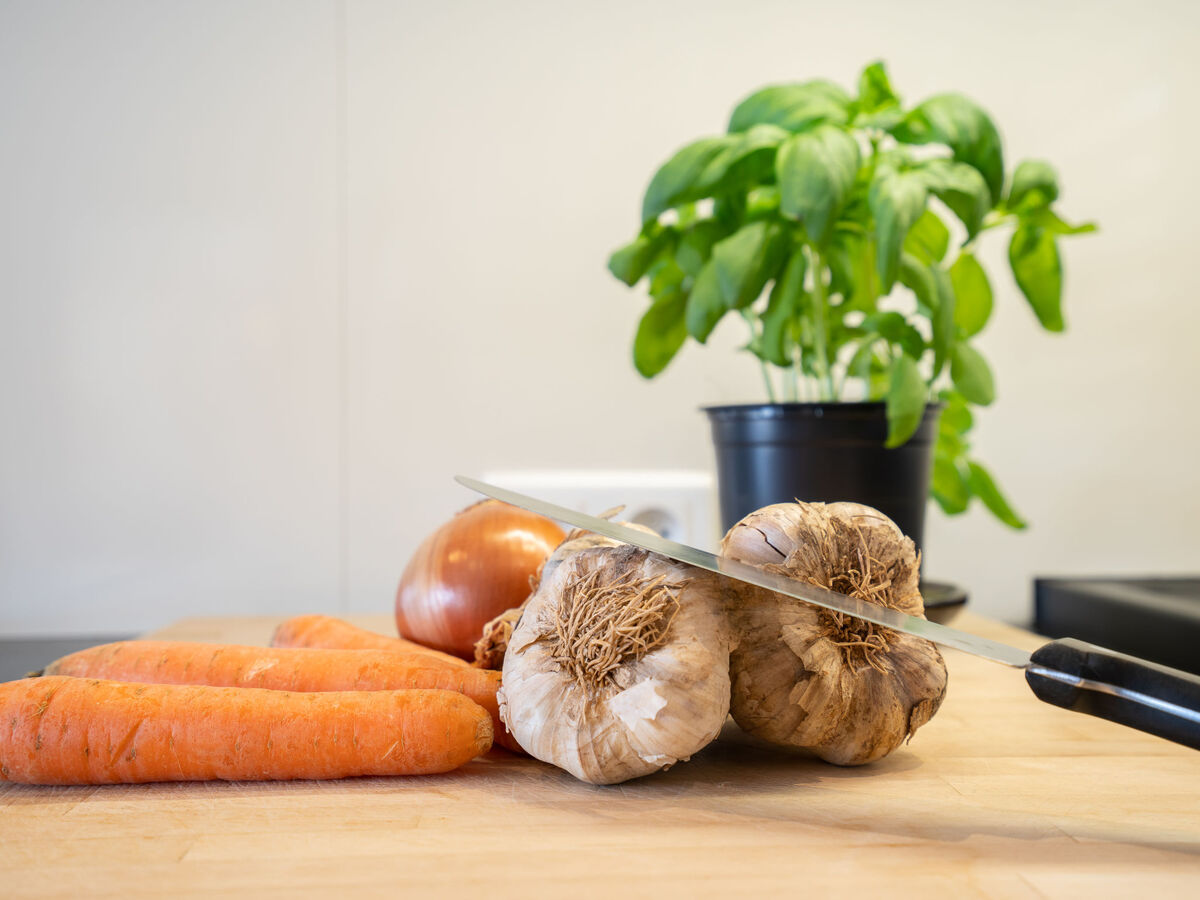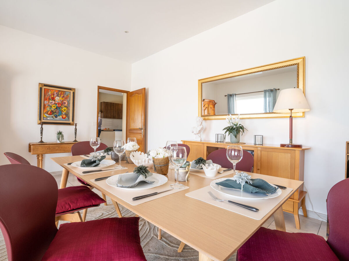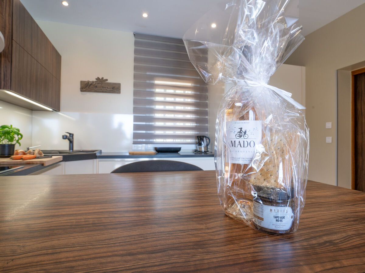 Cuisine (four, lave-vaisselle, 4 plaques vitrocéramiques, grille-pain, bouilloire électrique, micro-ondes, congélateur, cafetière électrique) avec petite table pour les repas.