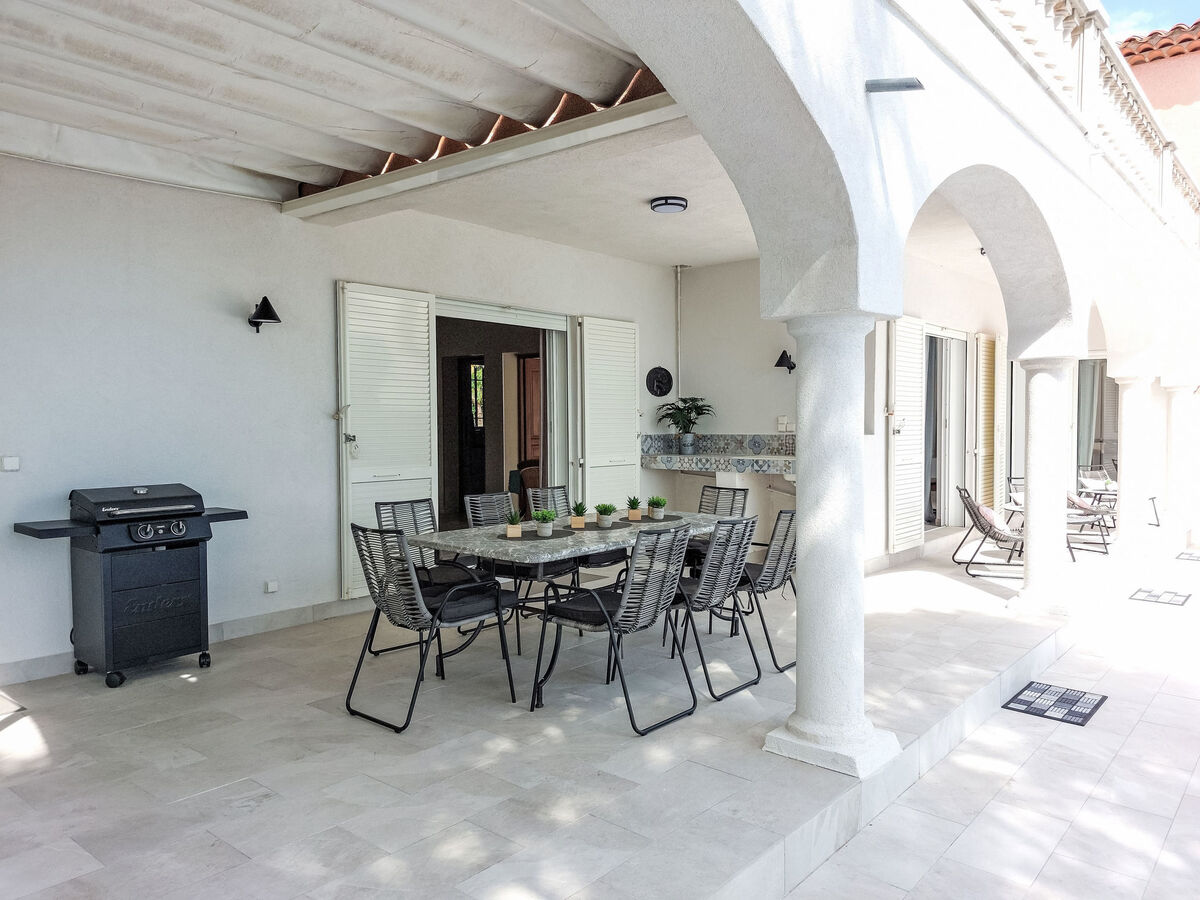 Meubles de terrasse, barbecue électrique, chaises longues.