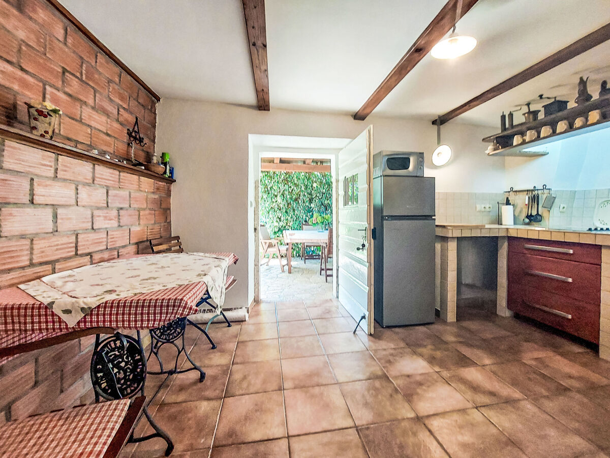 Cuisine ouverte (2 plaques de cuisson, four, 2 feux, congélateur).