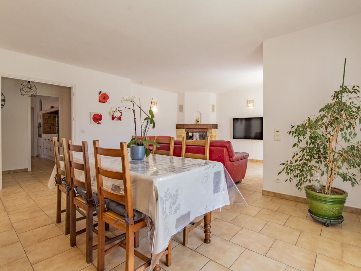 Aménagement confortable: séjour/salle à manger avec cheminée (uniquement à titre de décoration), table pour les repas et TV.